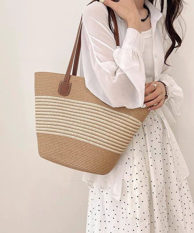 Unique Khaki Striped Large Capacity Straw Woven Shoulder Bags