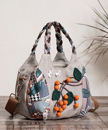 Art Grey Patchwork Fuzzy Ball Decorated Cotton Tote Handbag