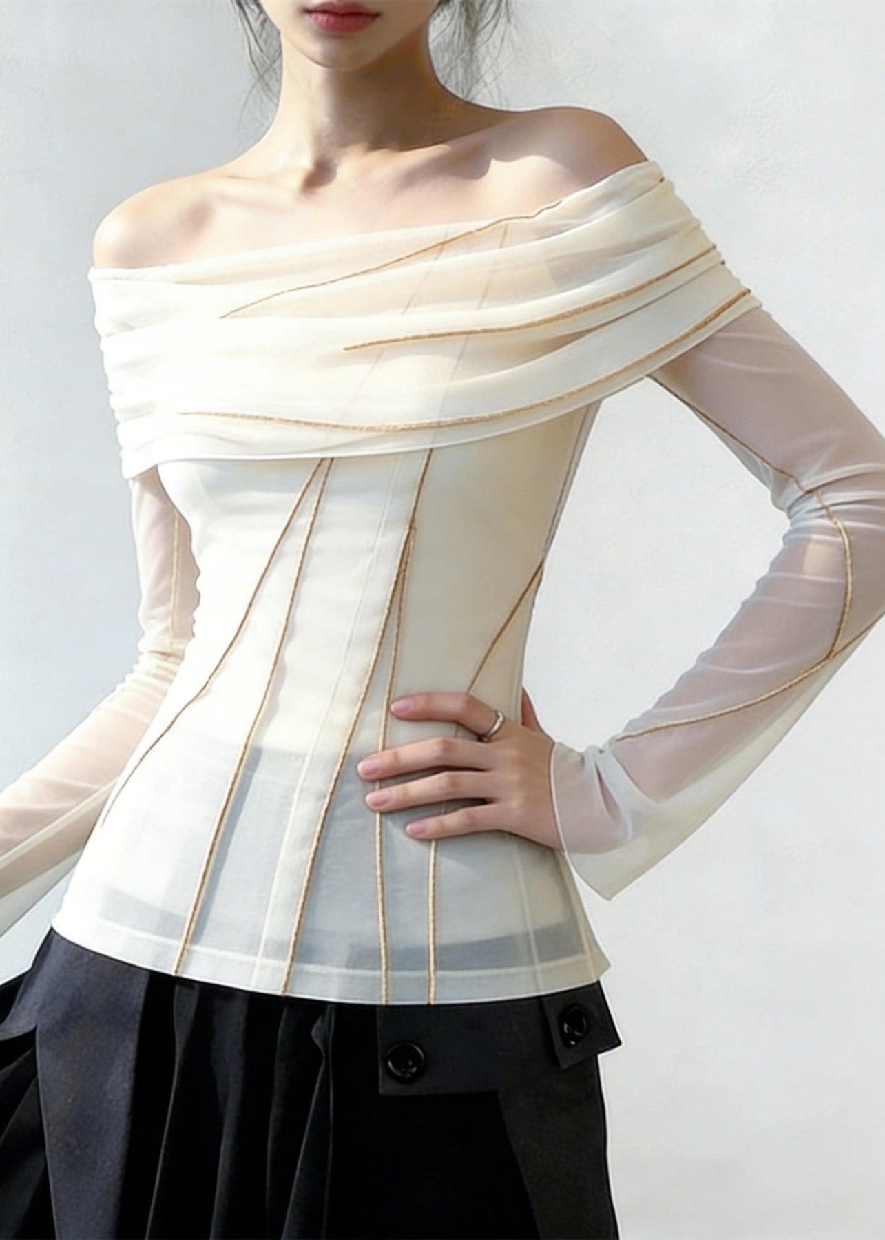 Slim Fit White Slash Neck Patchwork Tulle Blouses Spring