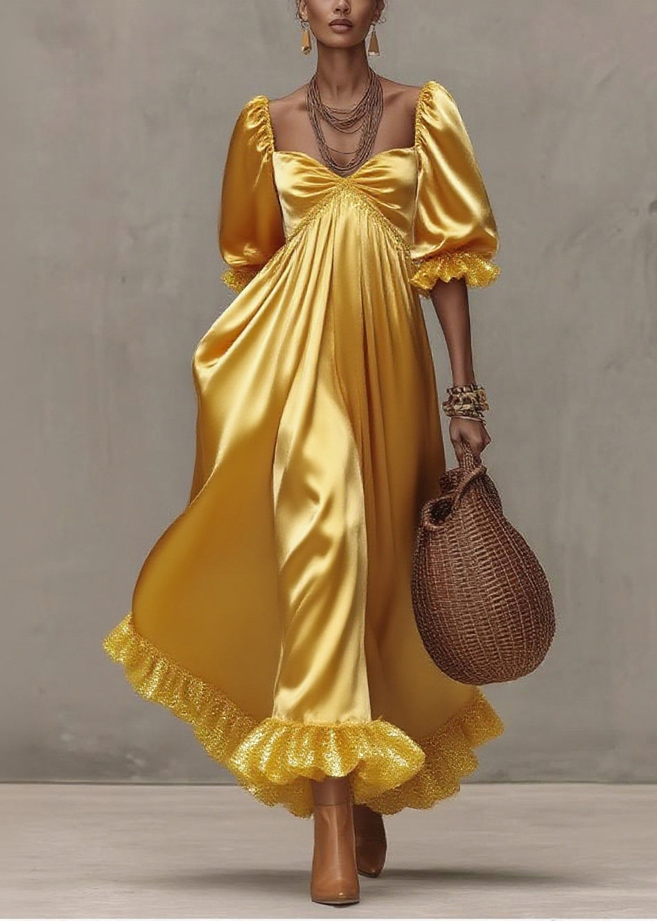 French Yellow Sequins Patchwork Exra Large Hem Silk Ankle Dress Summer