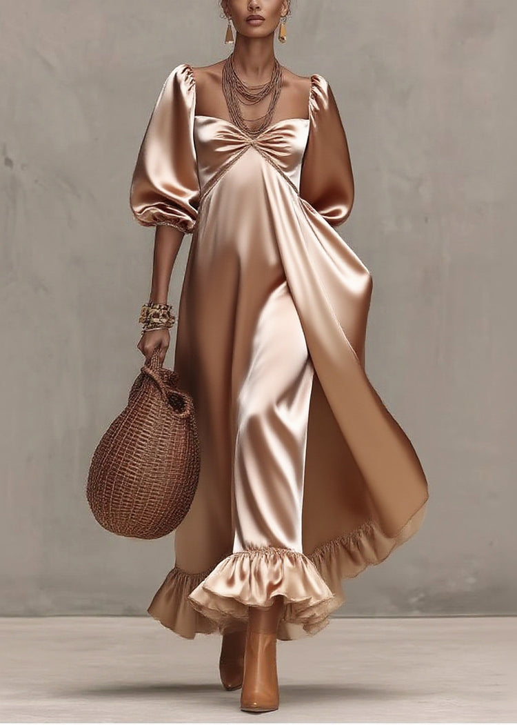Italian Nude Exra Large Hem Draping Silk Dress Lantern Sleeve