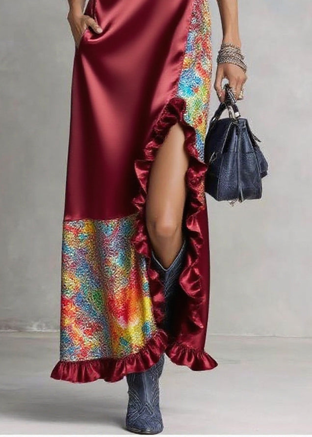Mulberry Patchwork Ruffled Silk Dresses Asymmetrical Design Sleeveless