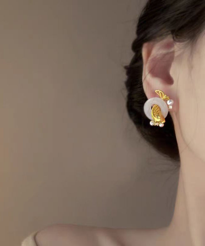 Chinese Style White Copper Overgild Jade Pearl Koi Fish Hoop Earrings