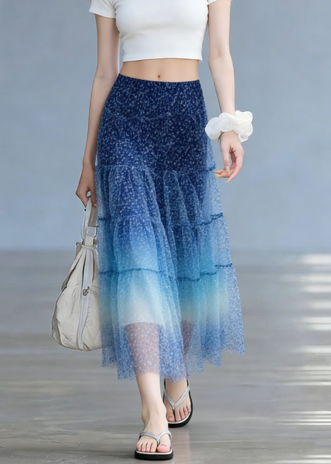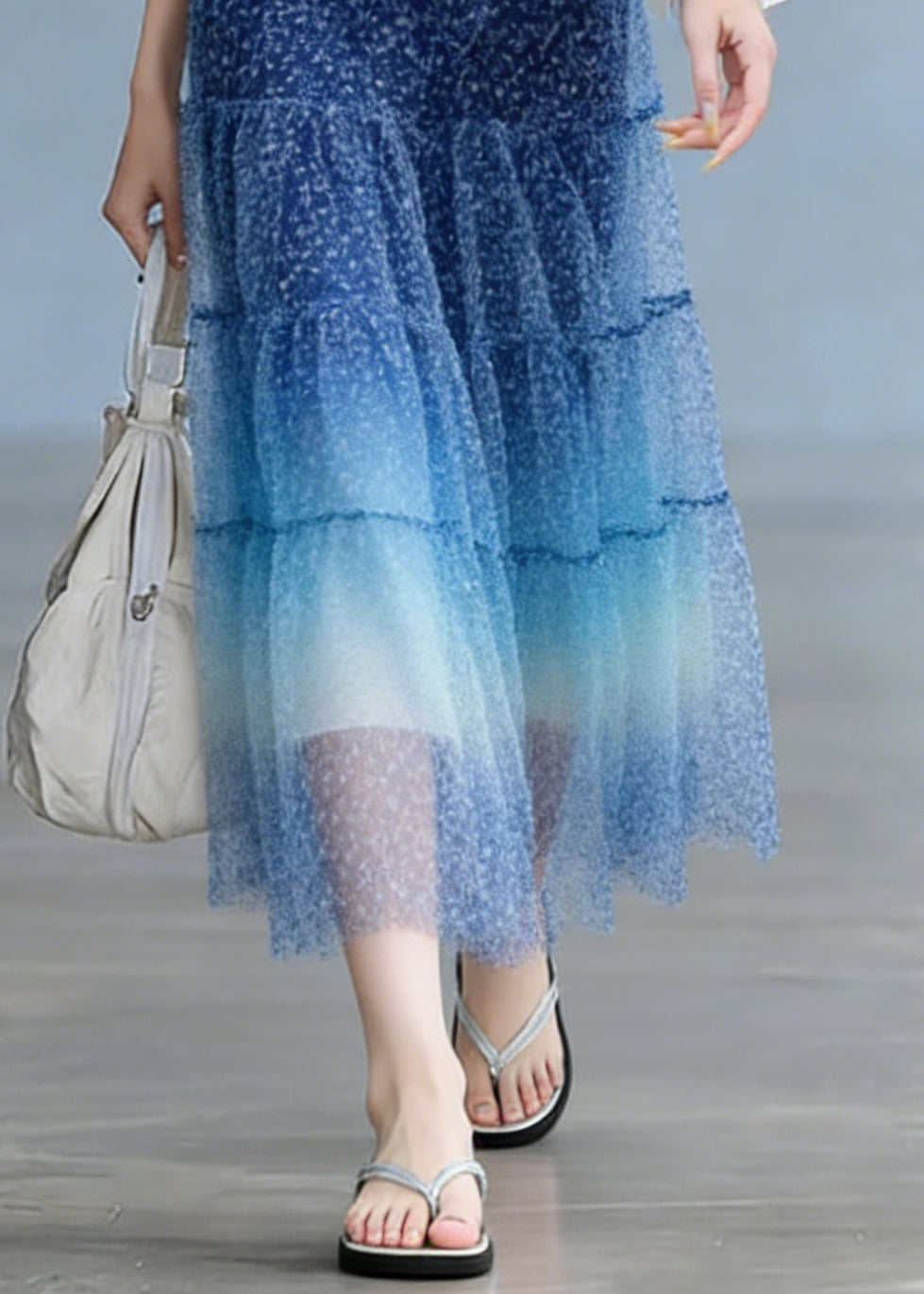 Stylish Blue Elastic Waist Patchwork Tulle Skirts Summer