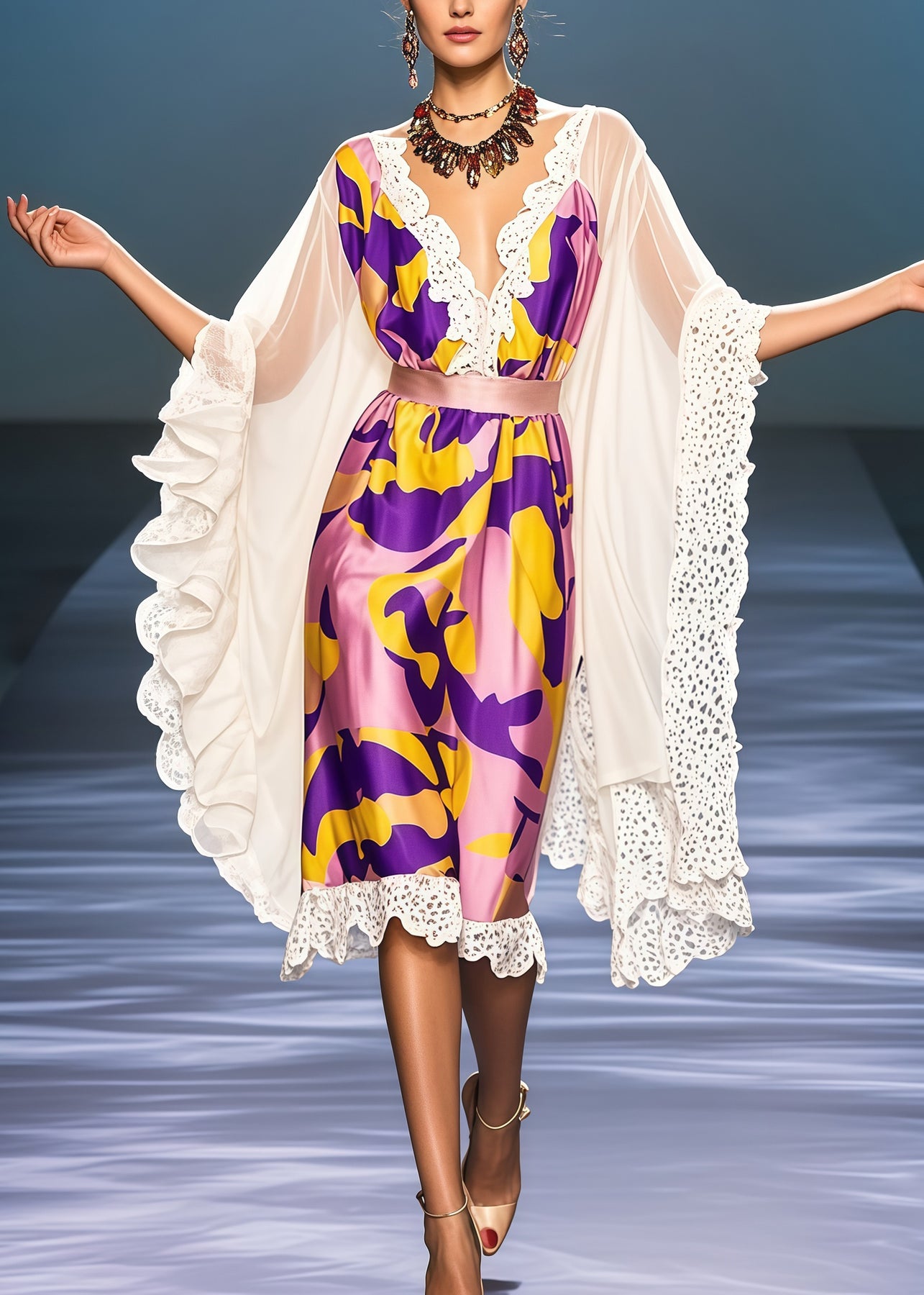 Modern Purple Ruffled Patchwork Silk Robe Dresses Summer
