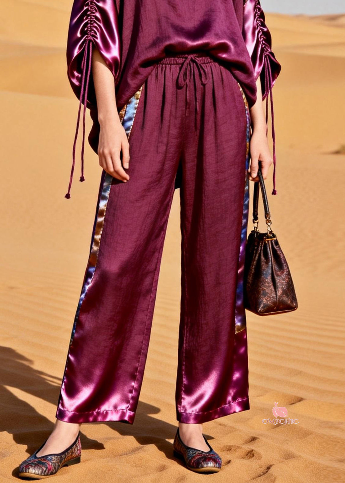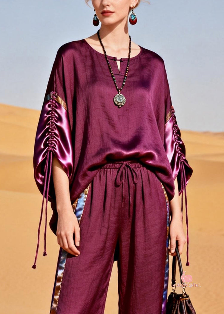 Boutique Purple Drawstring Elastic Waist Silk Patchwork Two Piece Set