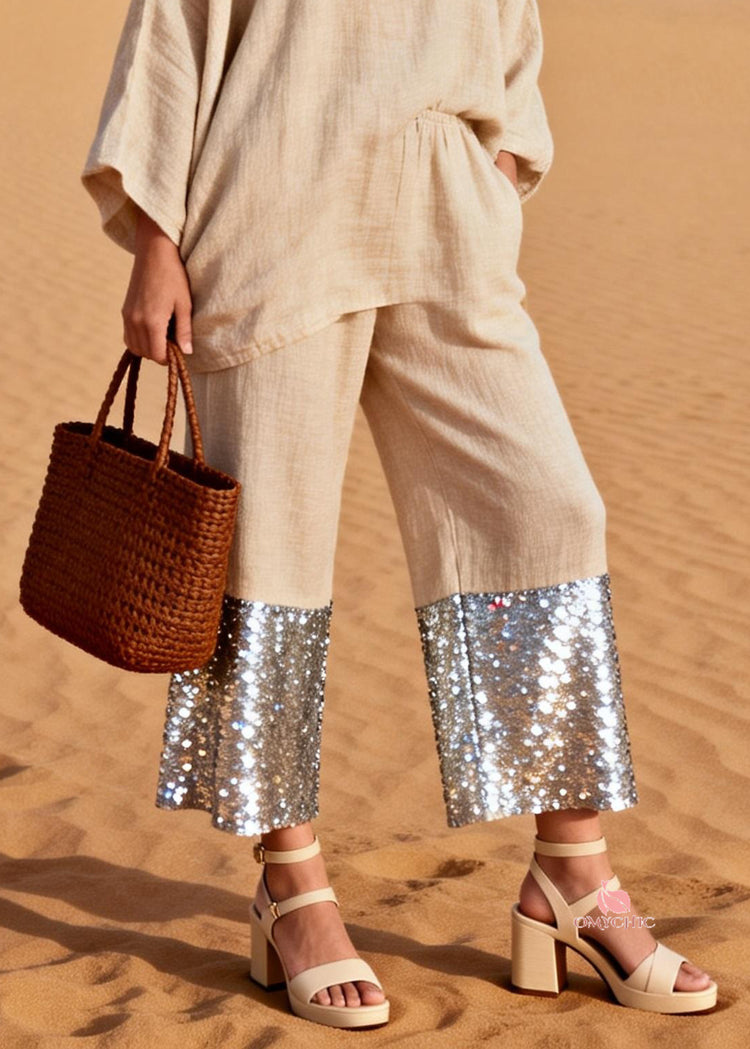 Khaki Sequins Patchwork Tops And Wide Leg Pants Two Pieces Set O Neck Spring