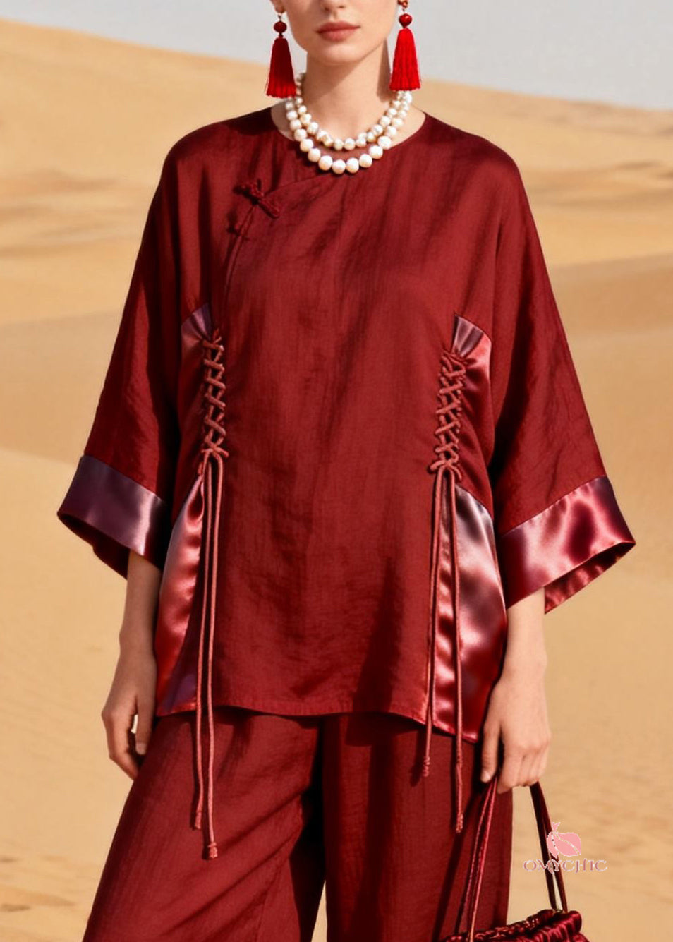 Modern Wine Red Drawstring Silk Patchwork Two Pieces Set Bracelet Sleeve