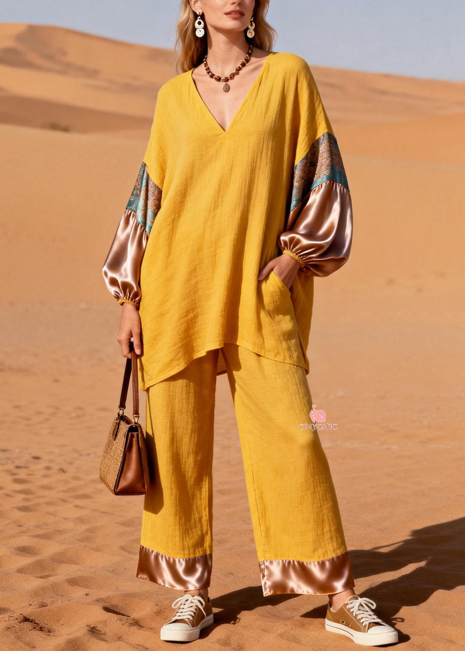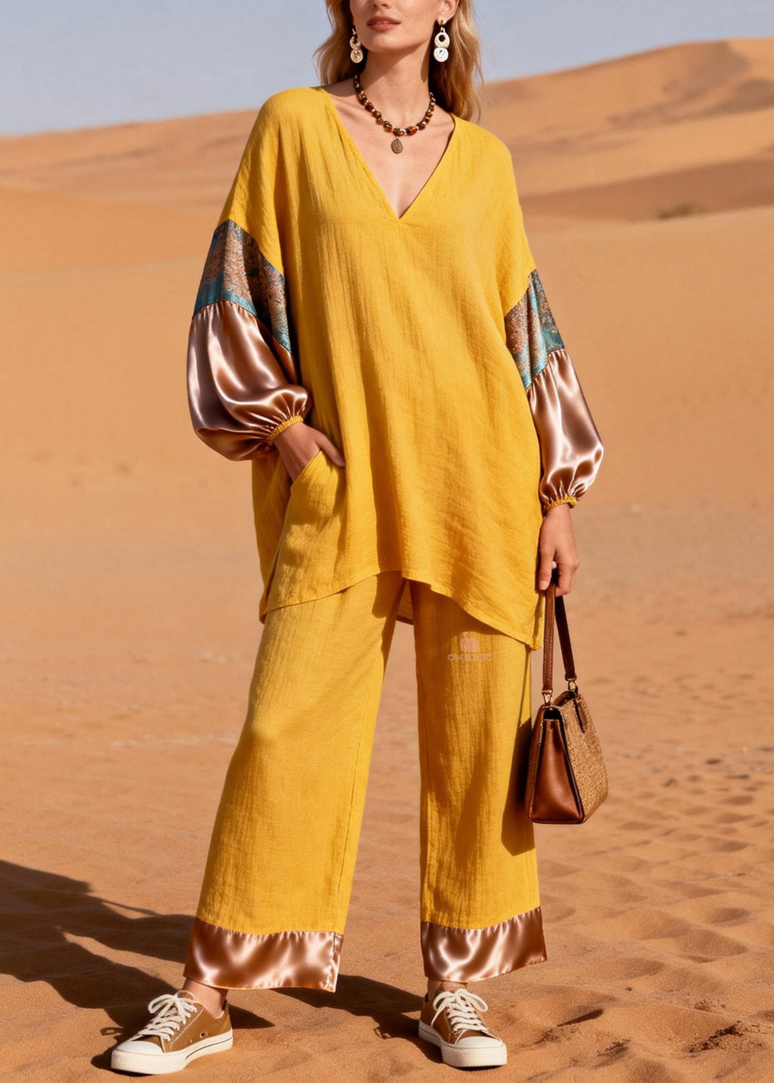 Art Yellow V Neck Patchwork Linen Silk Two Piece Set Spring