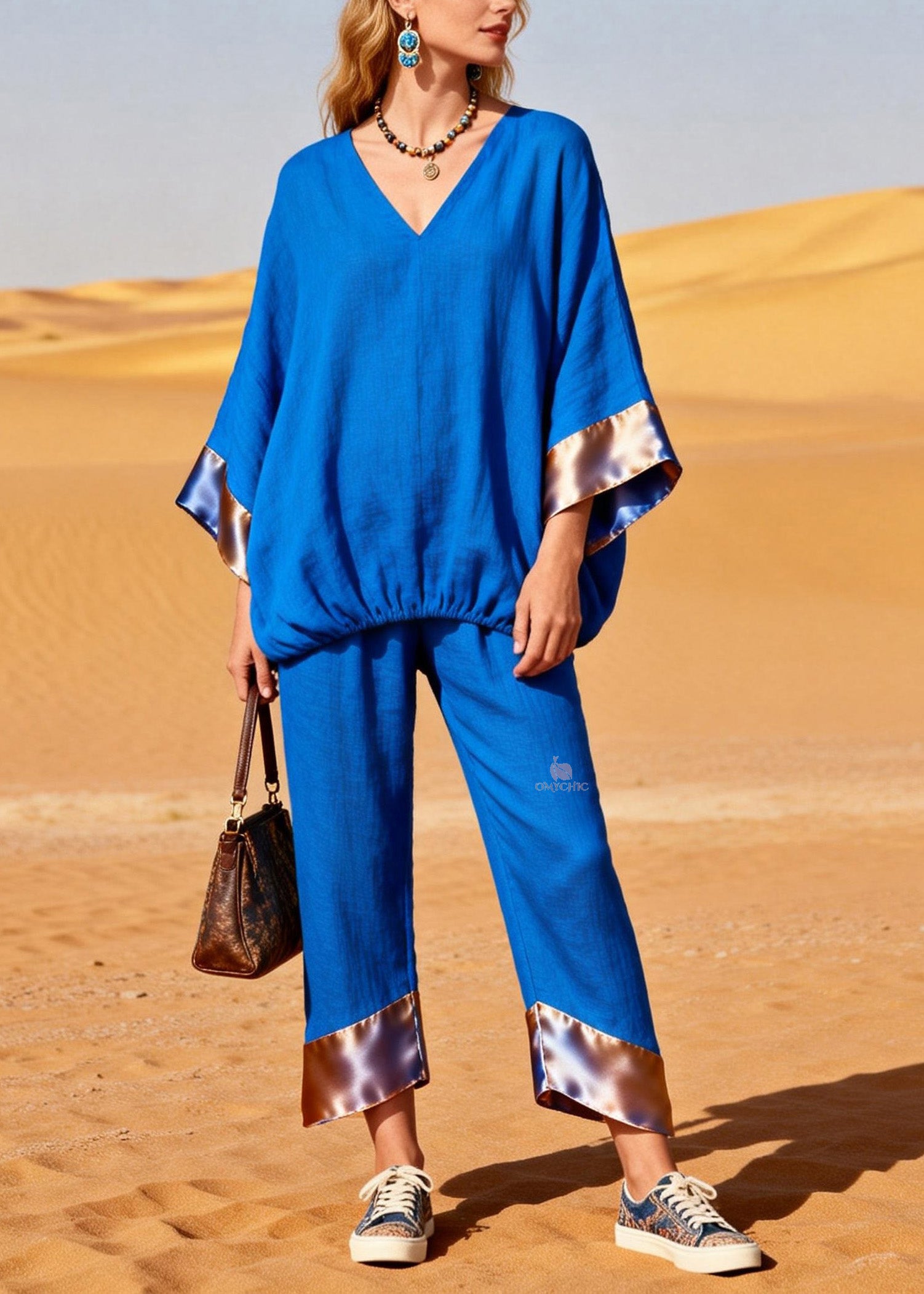 Women Blue V Neck Patchwork Linen Silk Two Pieces Set Summer