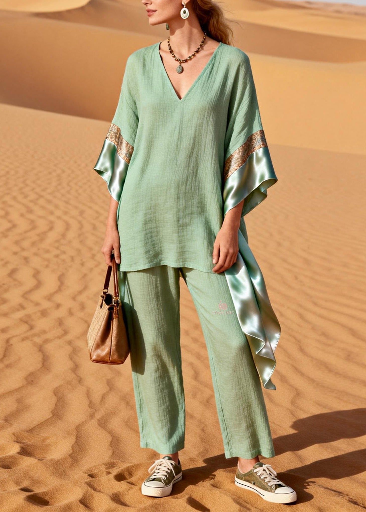 Casual Green V Neck Patchwork Linen Silk Two Pieces Set Summer