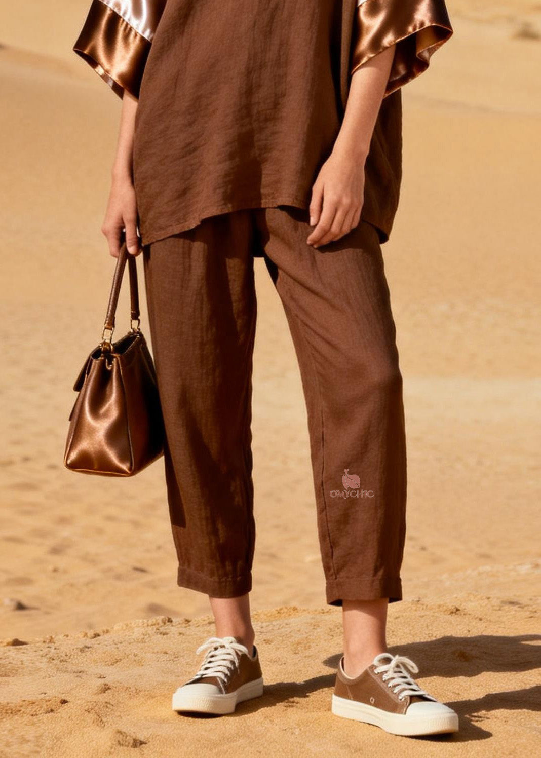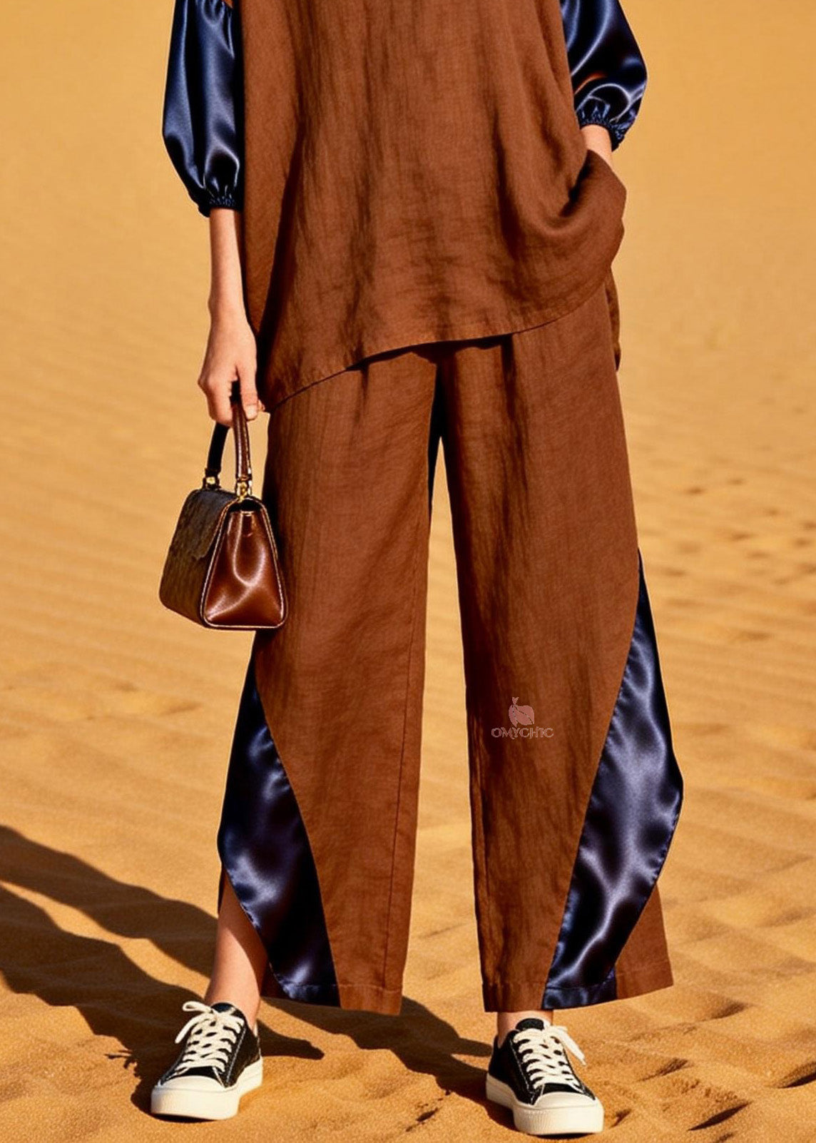 Fashion Coffee V Neck Patchwork Linen Silk Two Piece Set Spring