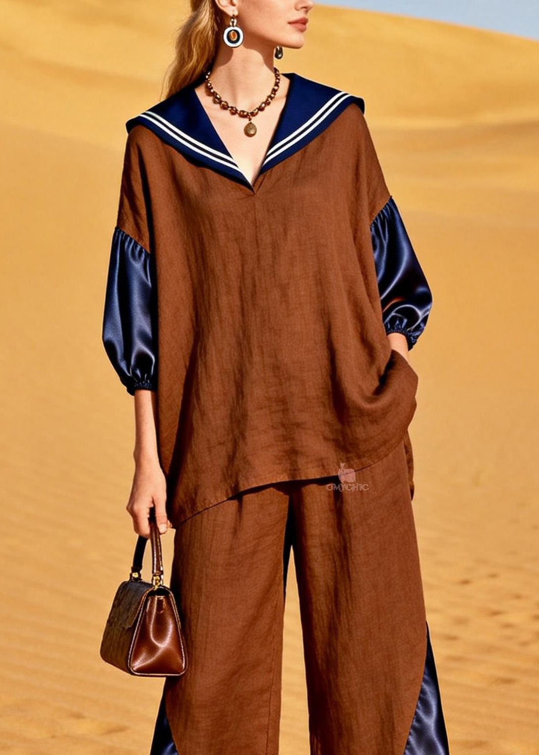 Italian Sailor Collar Patchwork Linen Silk Two Pieces Set Spring