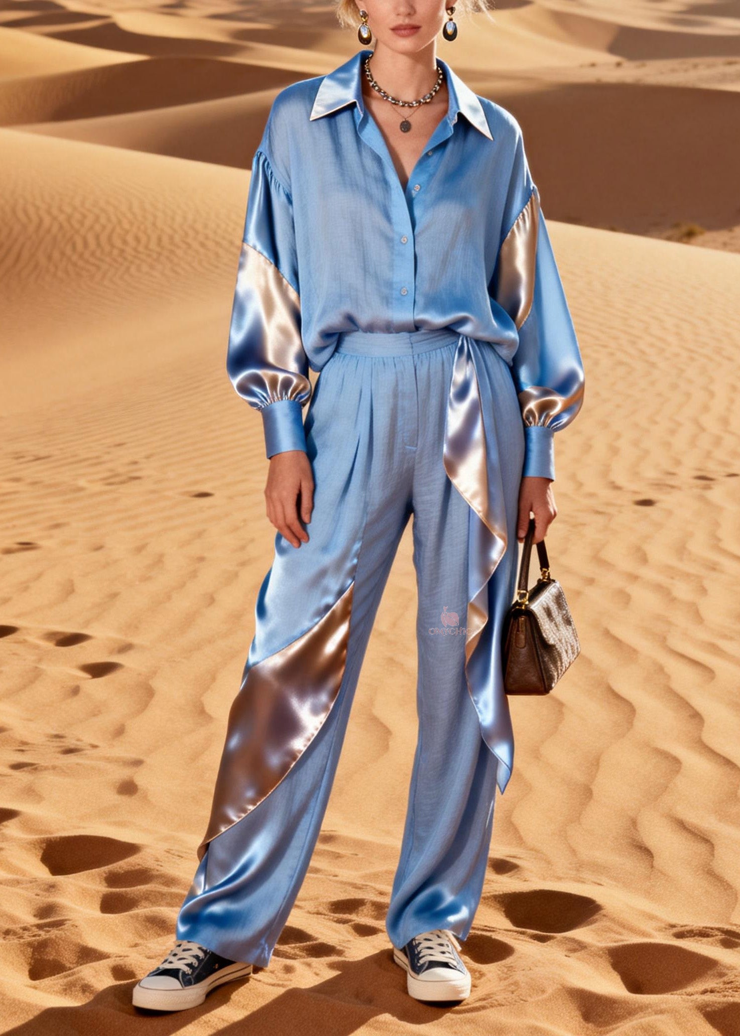 Boutique Blue Top And Pants Silk Patchwork Linen Two Pieces Set Summer