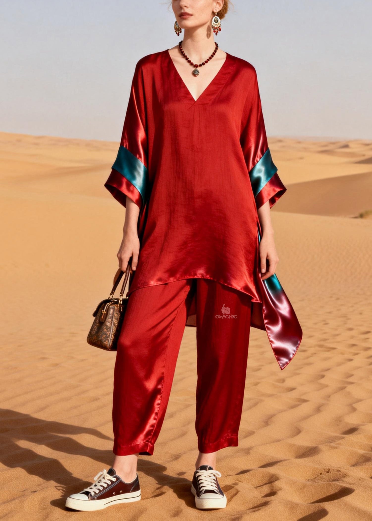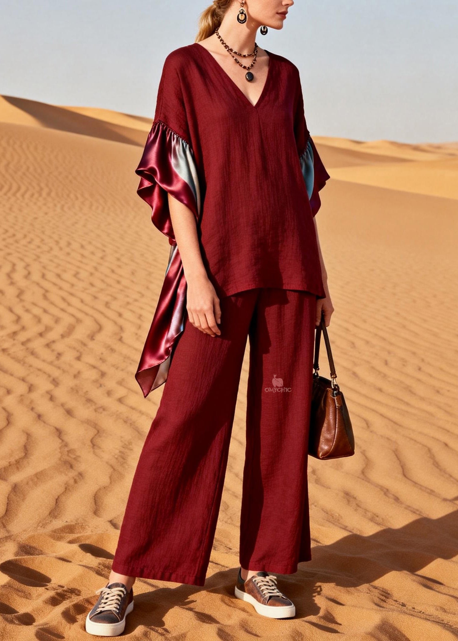 Unique Red V Neck Patchwork Linen Silk Two Pieces Set Summer