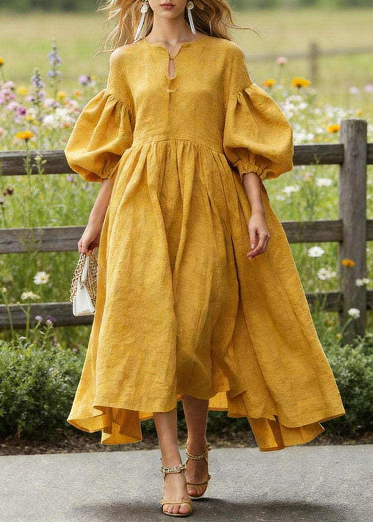 Boho Yellow Exra Large Hem Cotton Maxi Dresses Lantern Sleeve