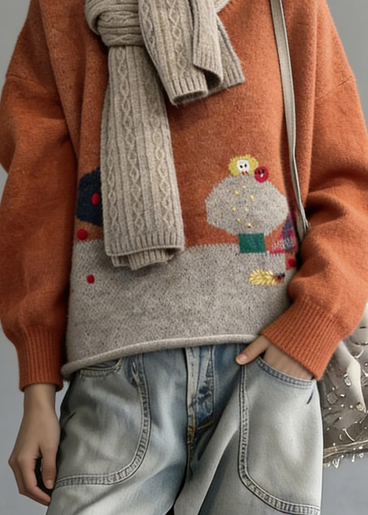 Casual Orange O-Neck Oversized Cartoon Print Knitted Tops Winter