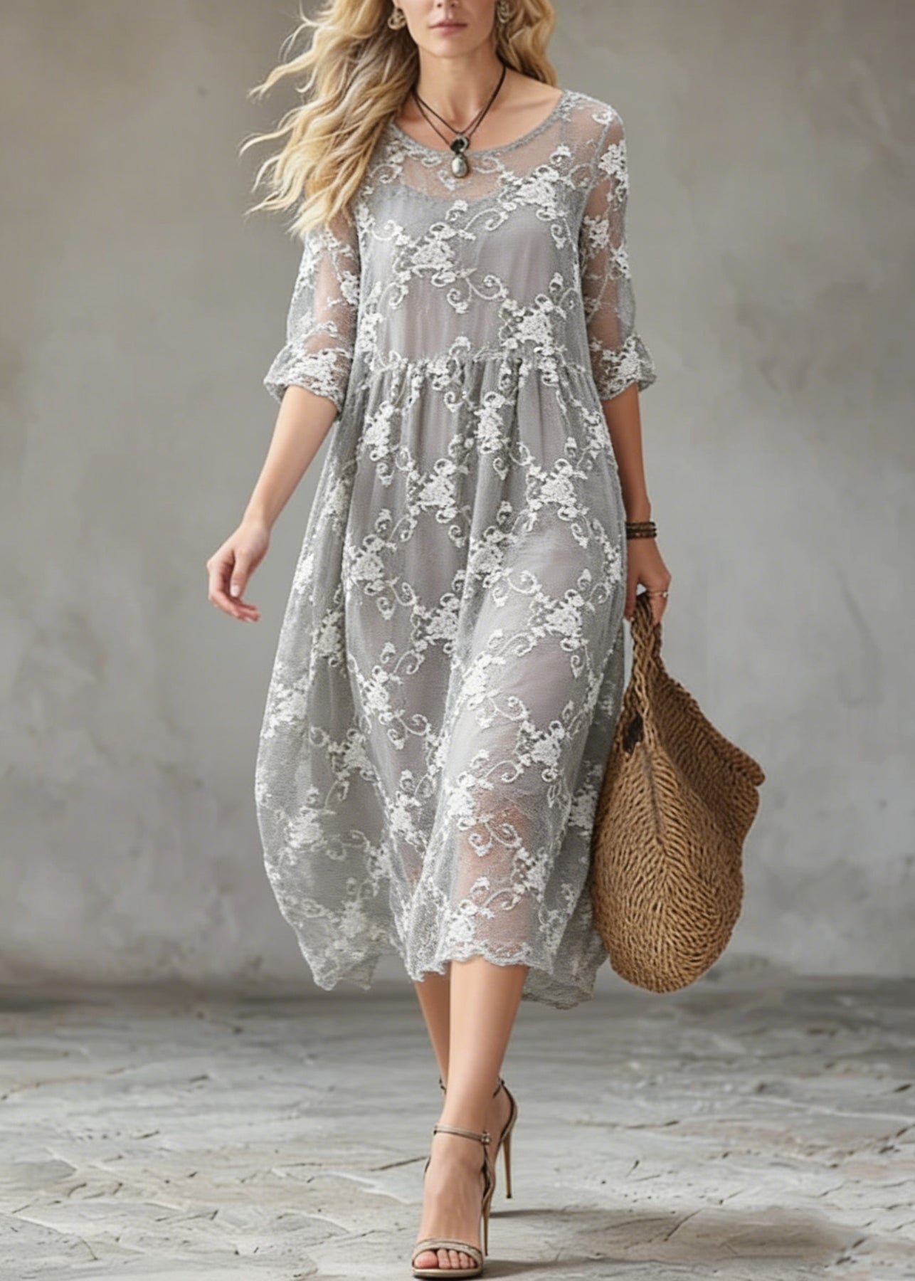Elegant Grey O-Neck Embroidered Silk Cotton Dress Summer