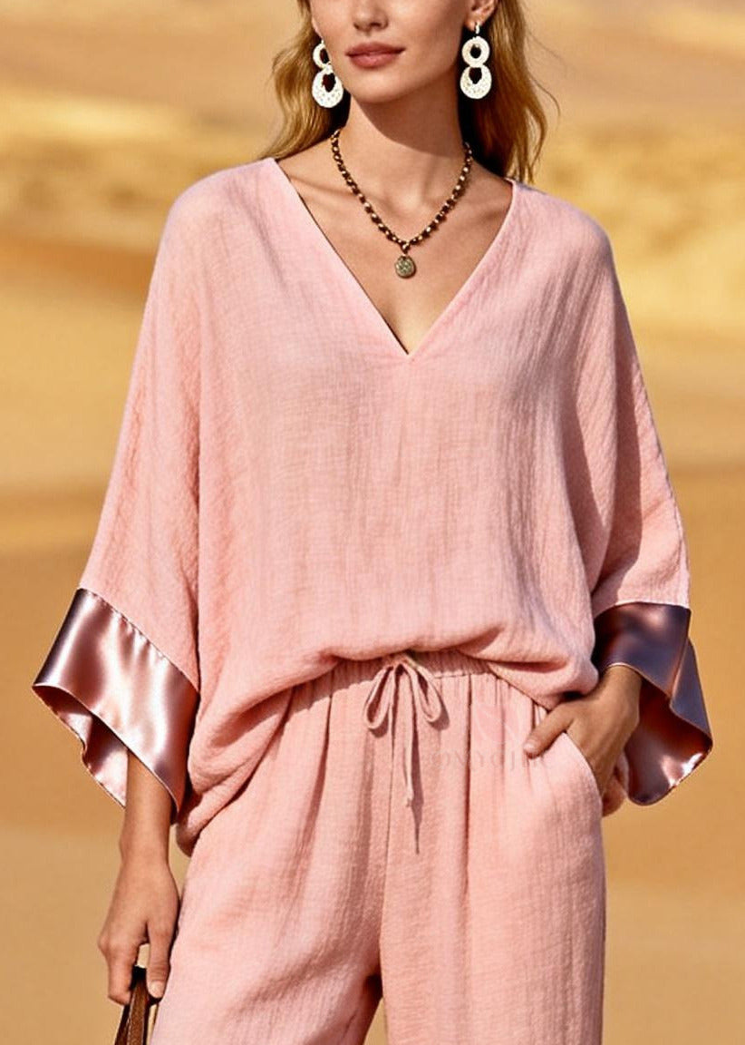 Casual Pink V Neck Patchwork Cotton Two Piece Set Women Clothing Spring