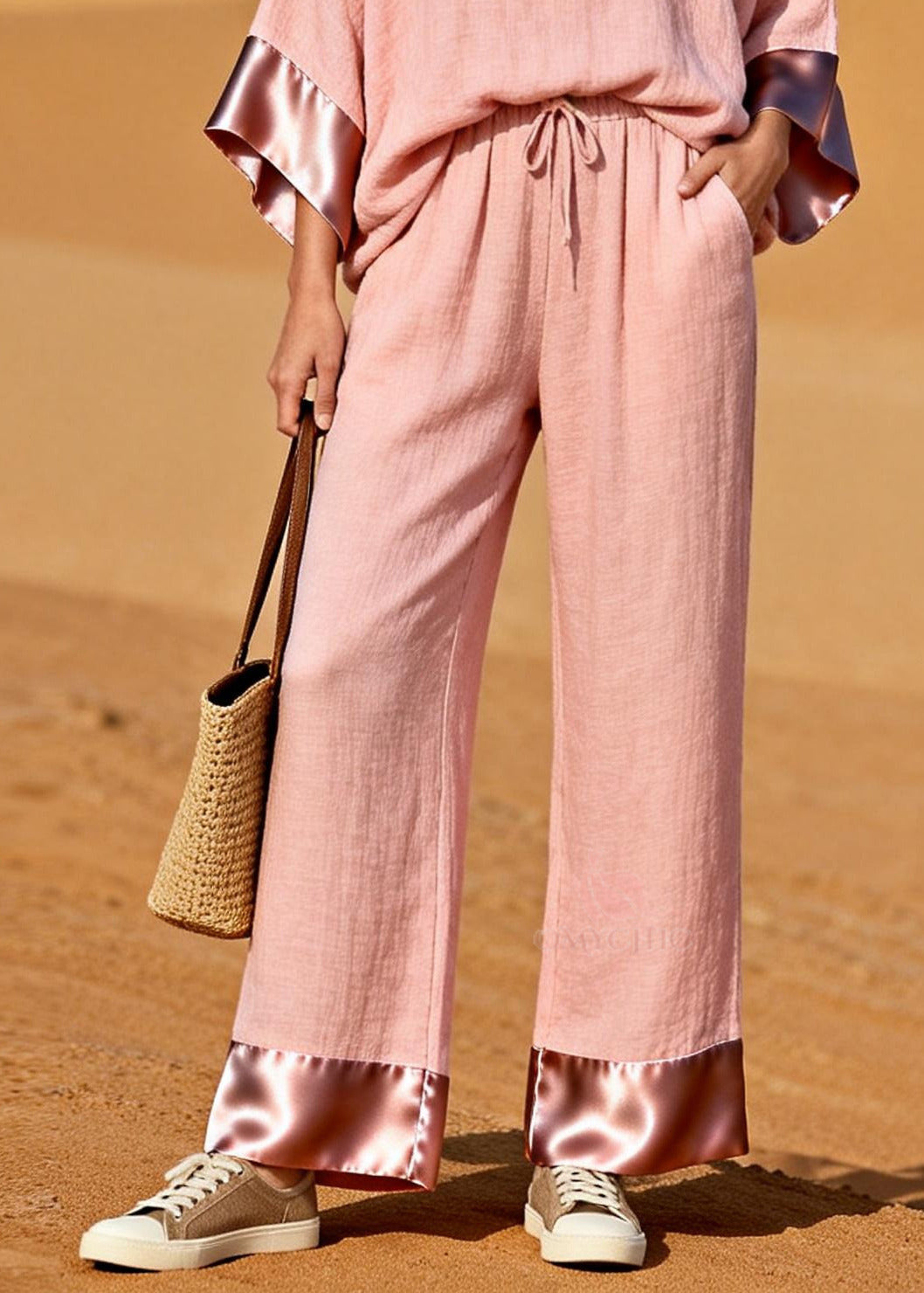 Plus Size Pink Oversized Patchwork Linen Silk Two Pieces Set Spring