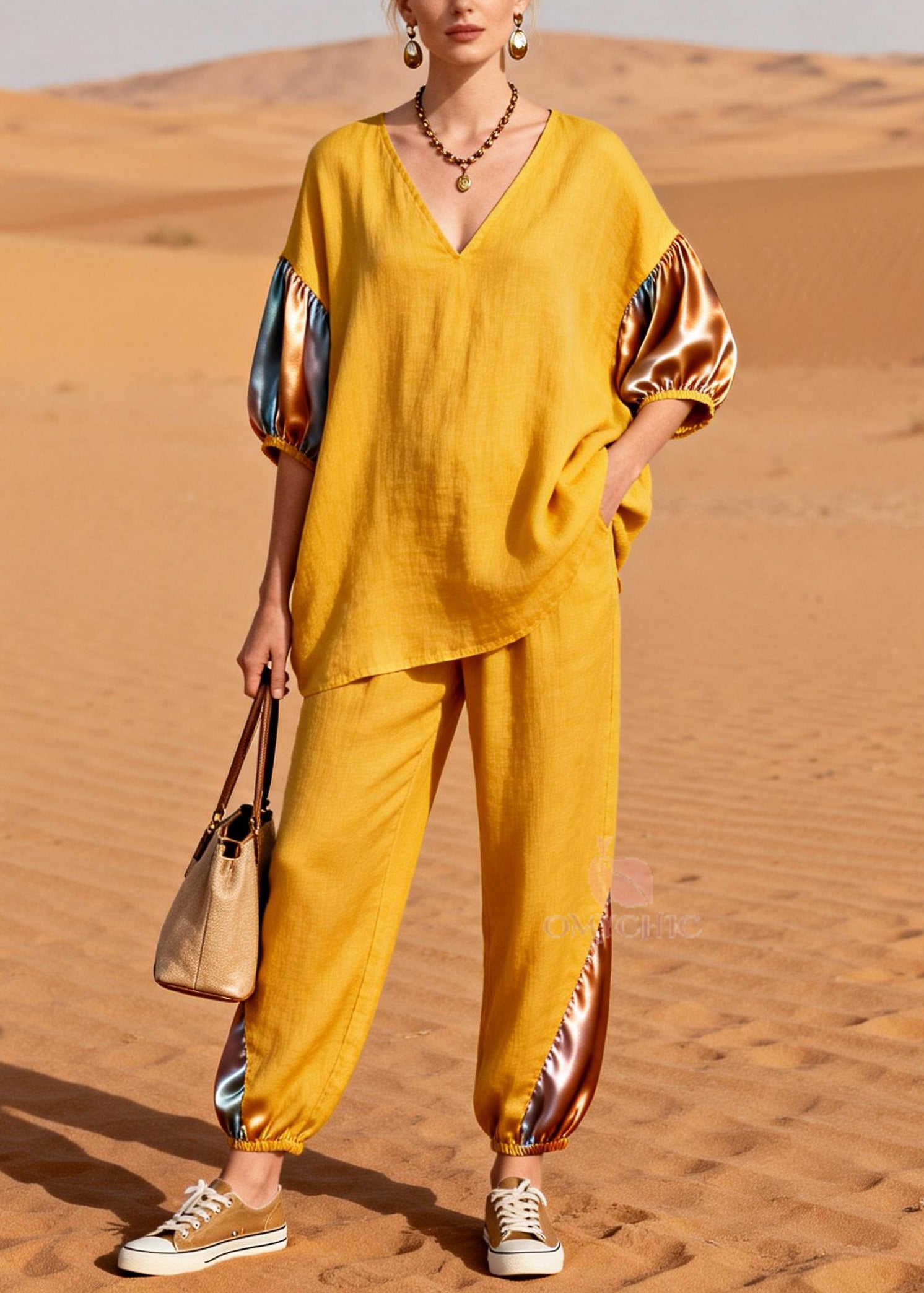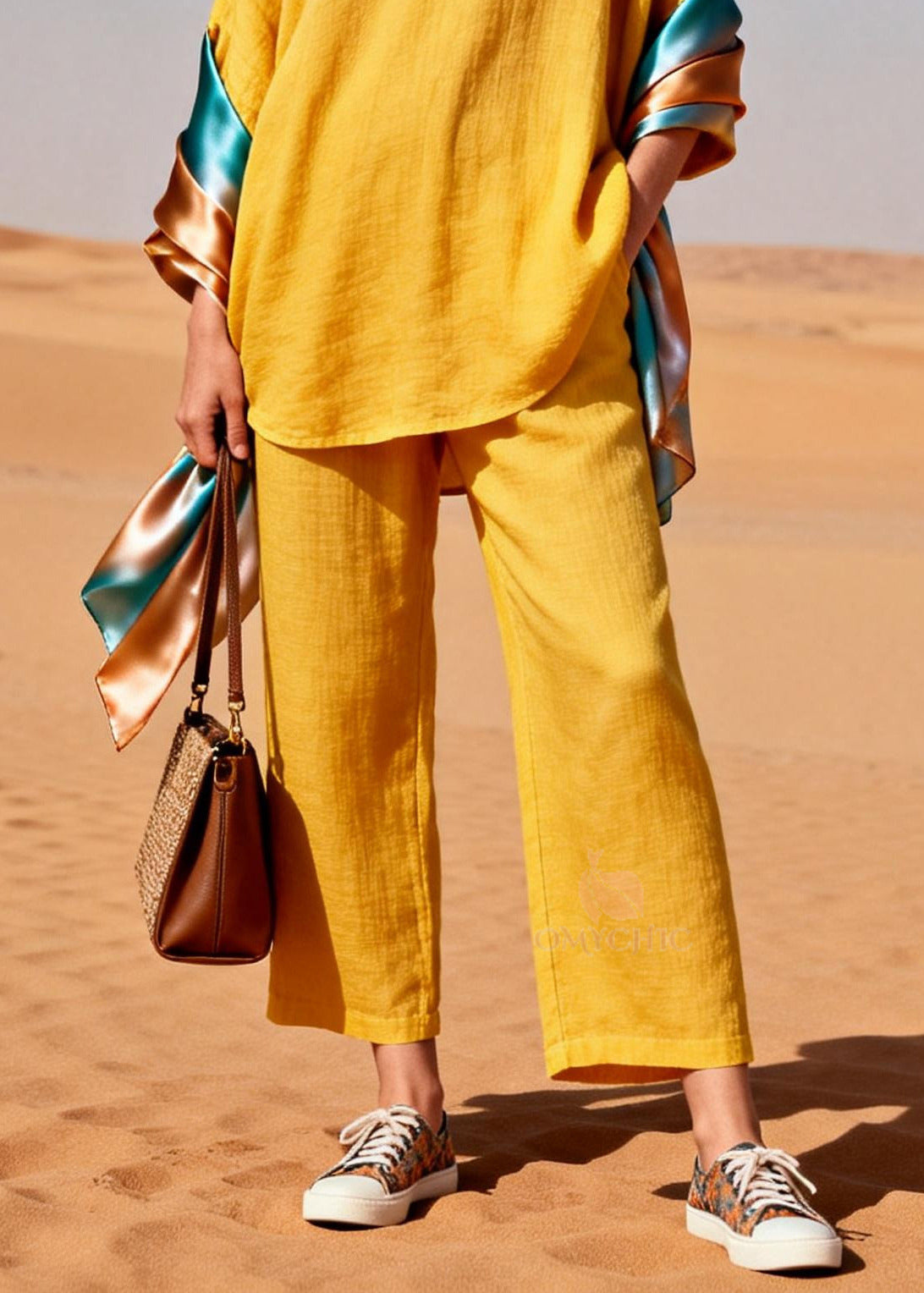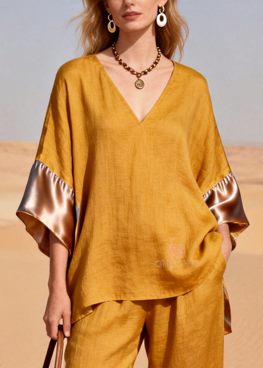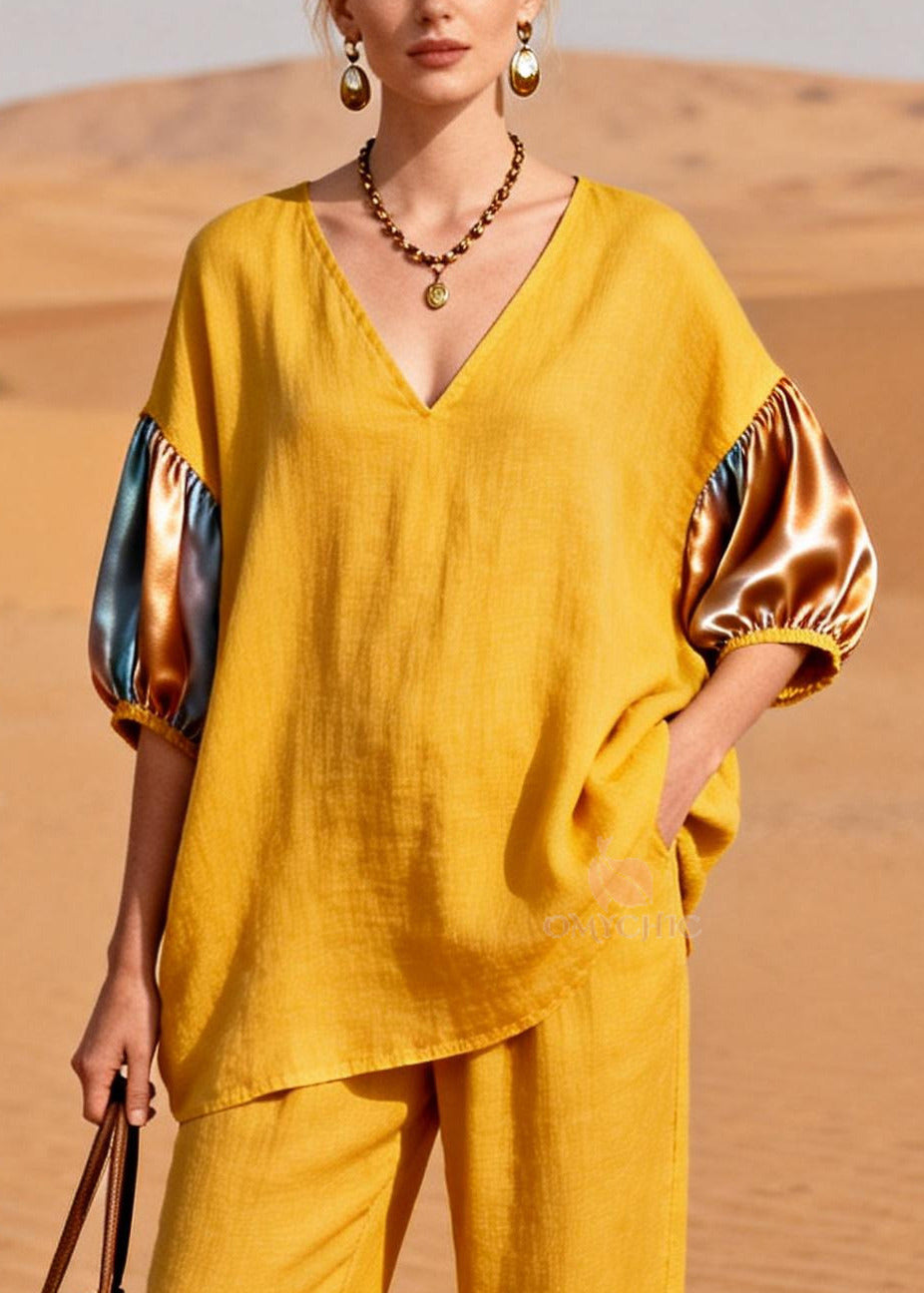 Women Yellow Oversized Patchwork Linen Silk Two Pieces Set Summer