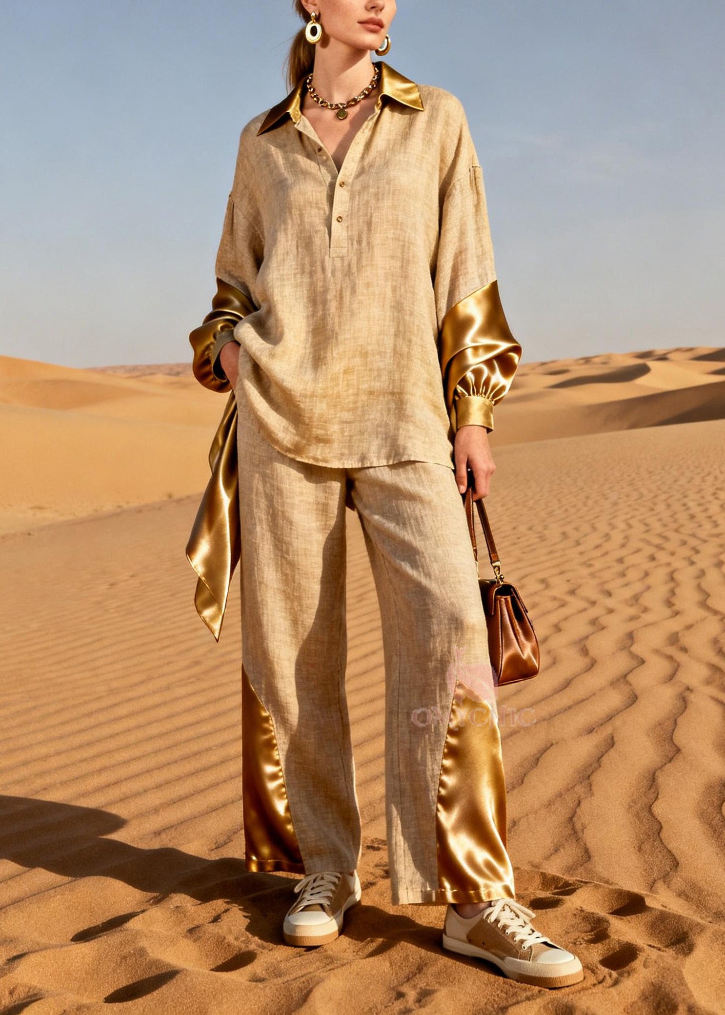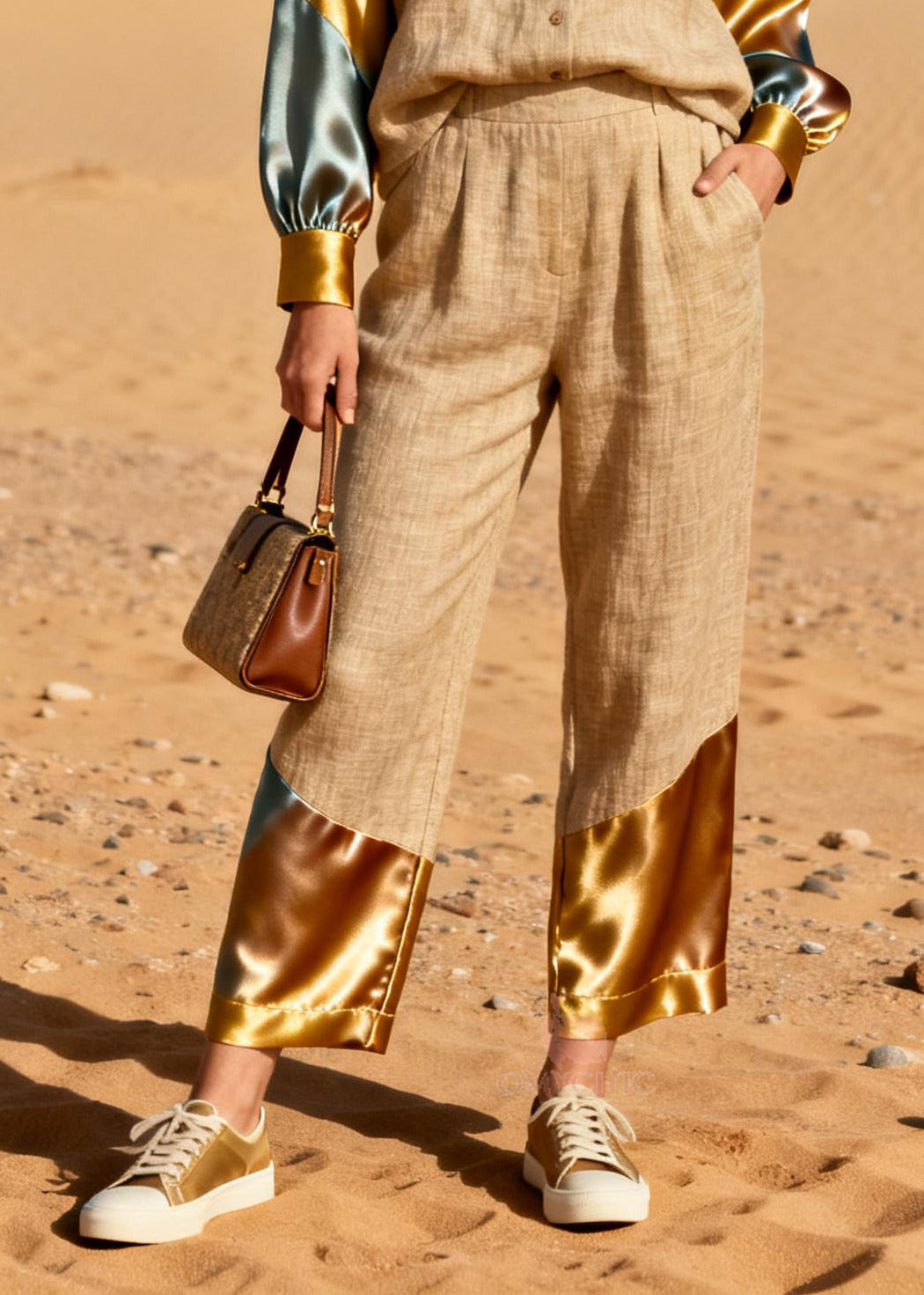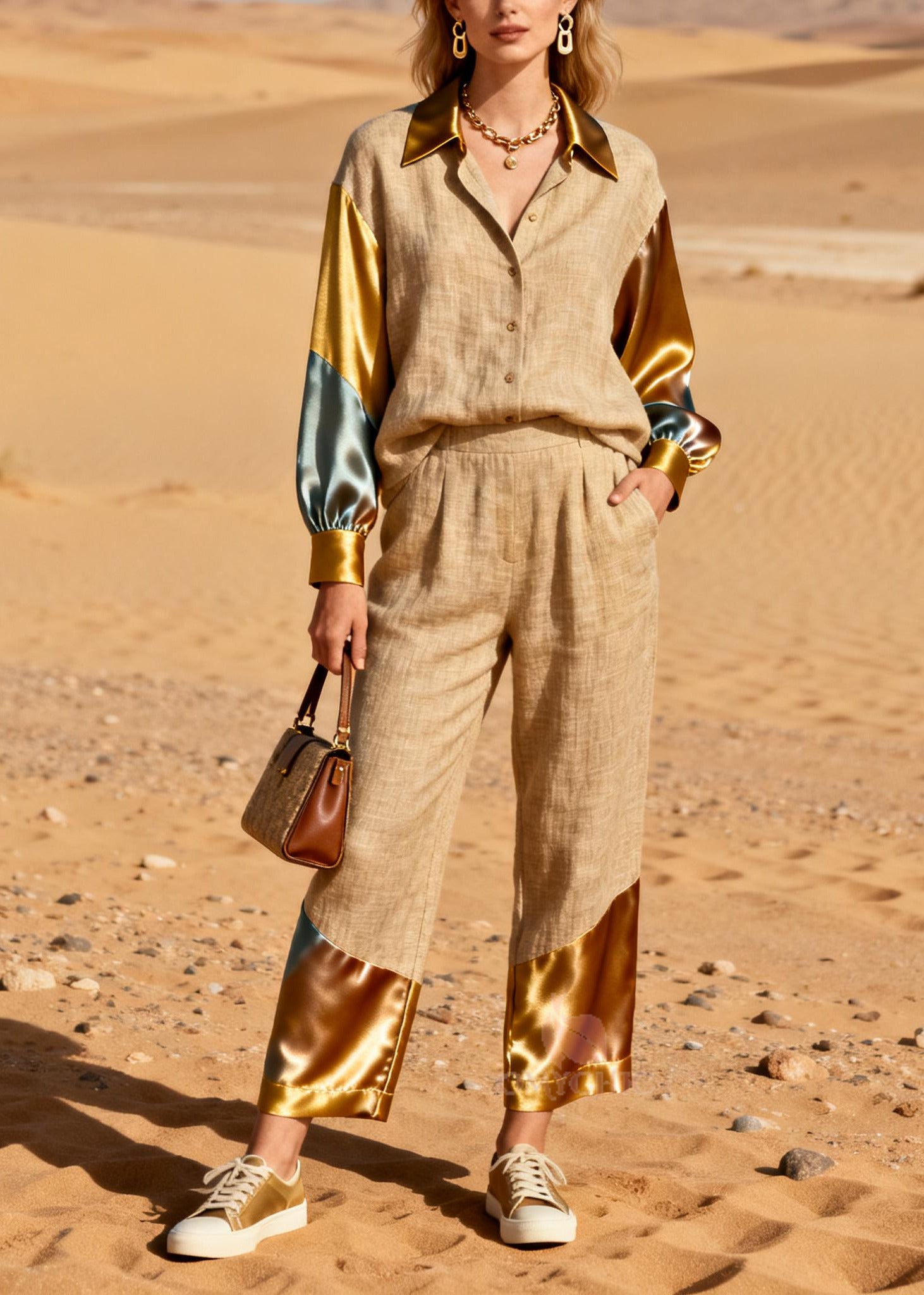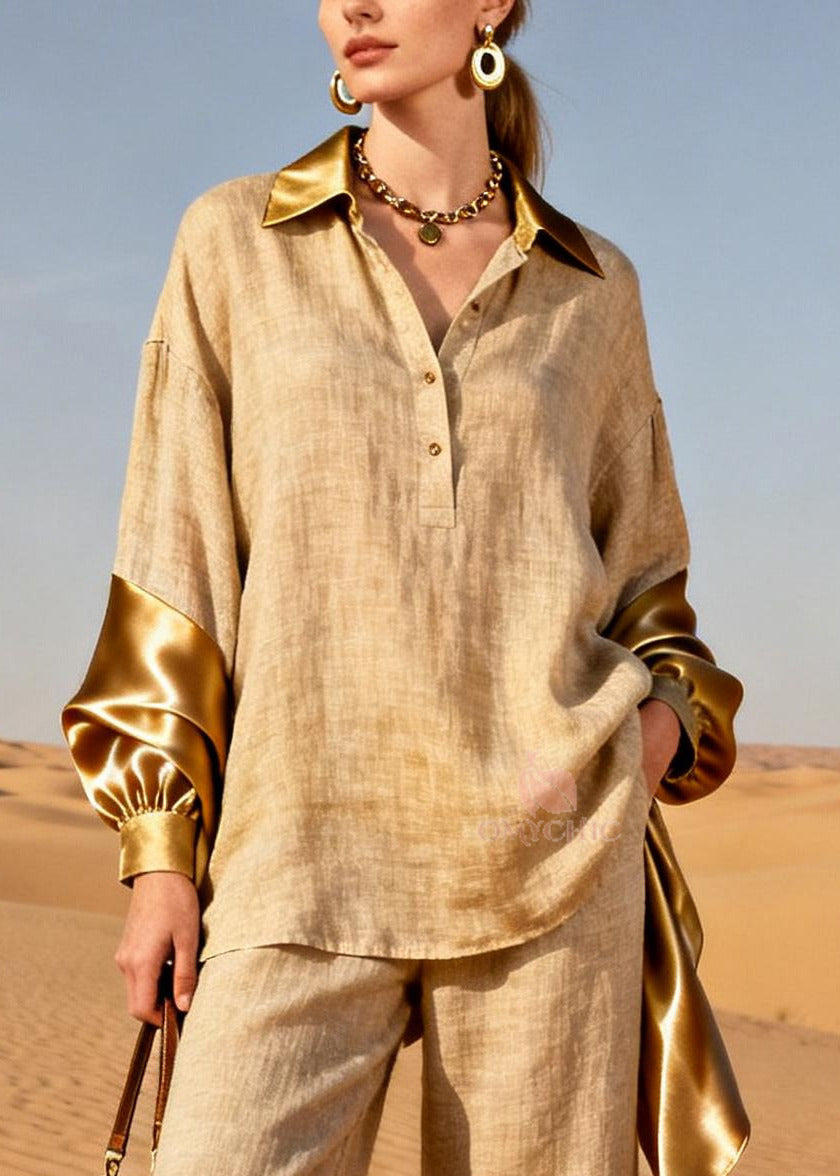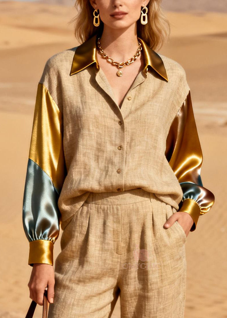 Fine Golden Oversized Patchwork Linen Silk Two Pieces Set Spring