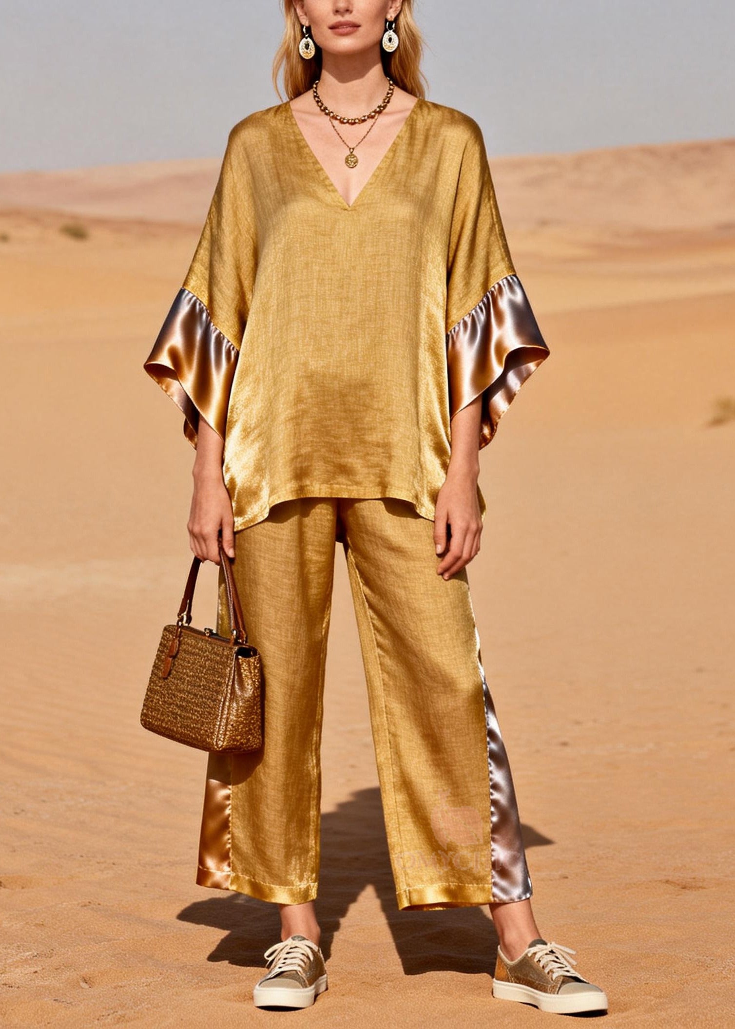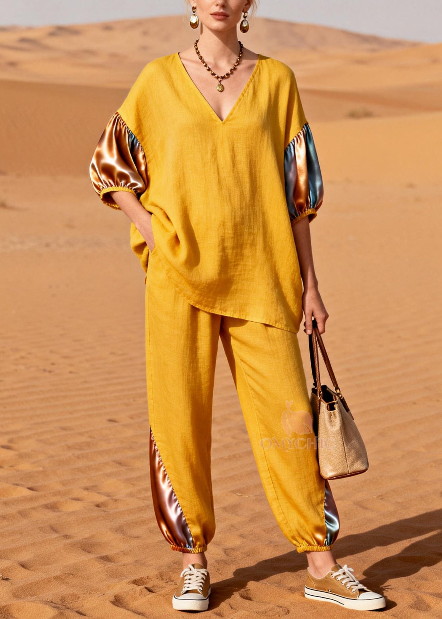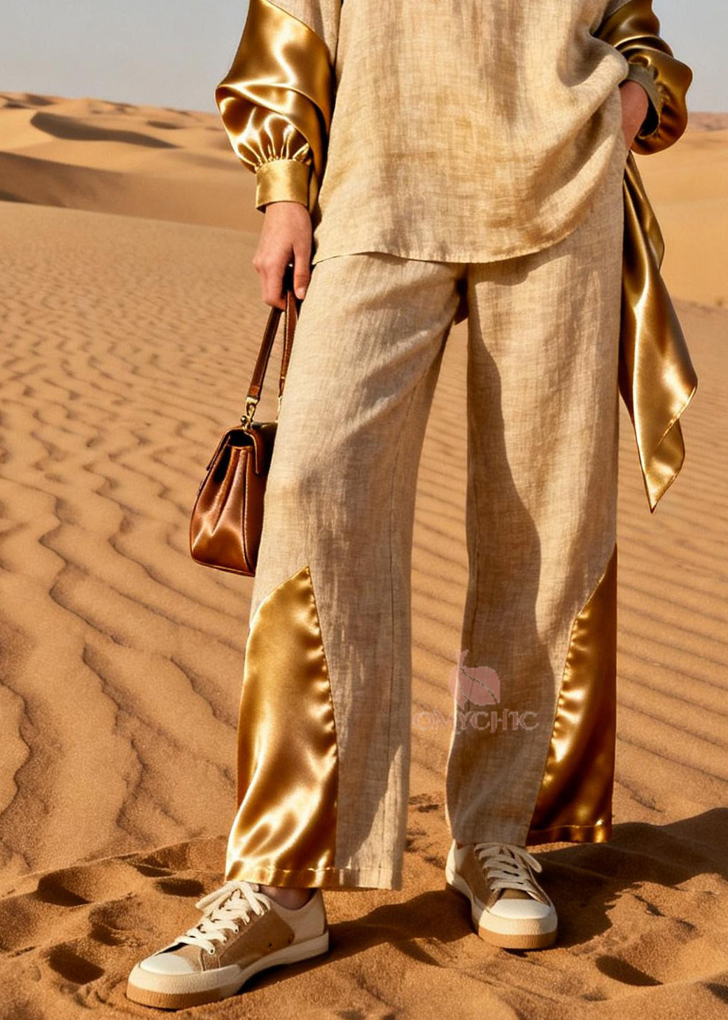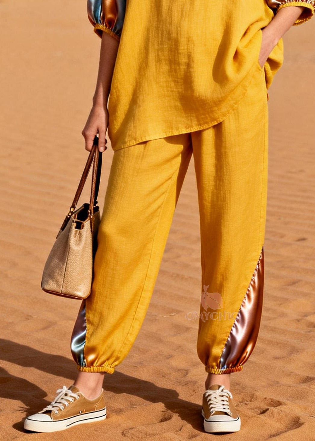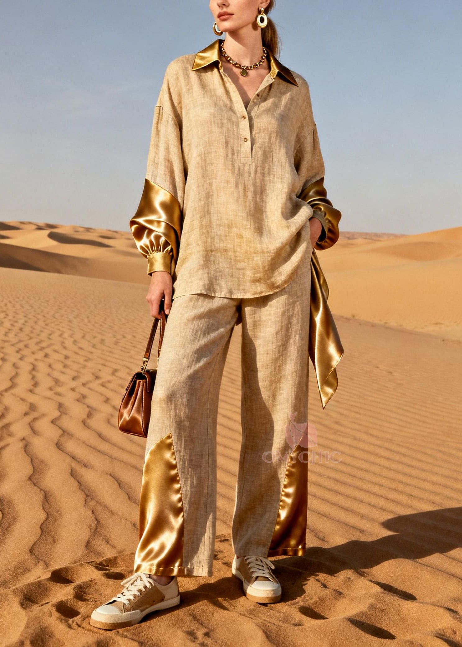 Fine Golden Oversized Patchwork Linen Silk Two Pieces Set Spring