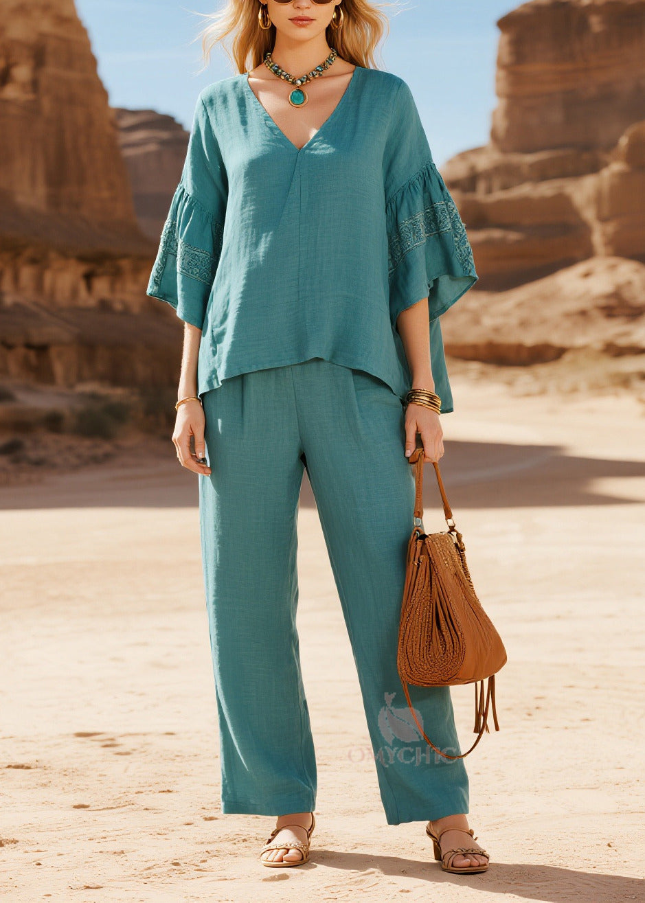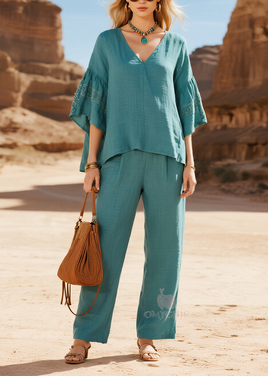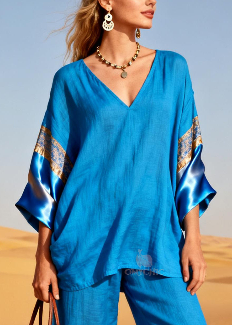 Fine Sea Blue V Neck Oversized Cotton Two Pieces Set Flare Sleeve