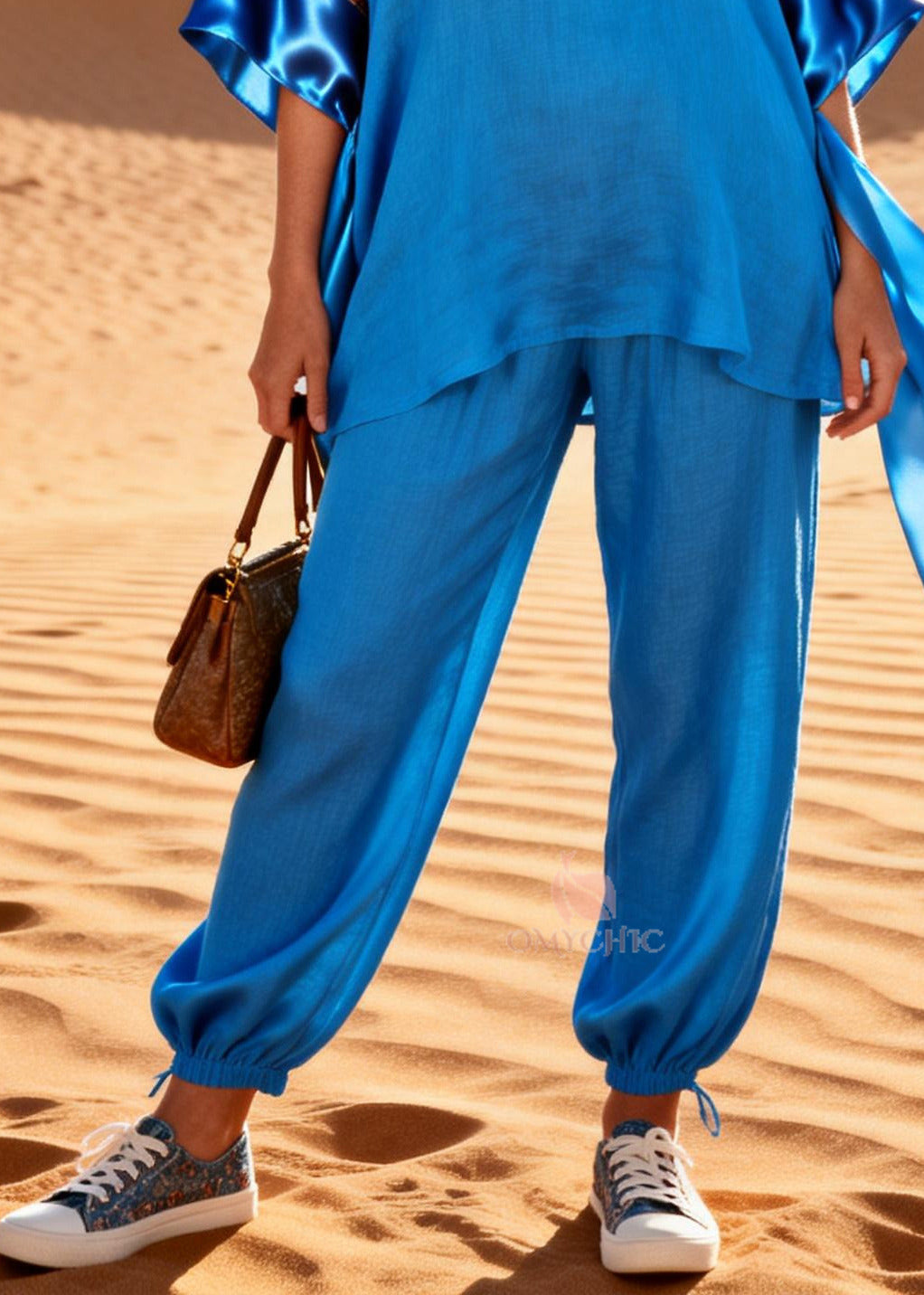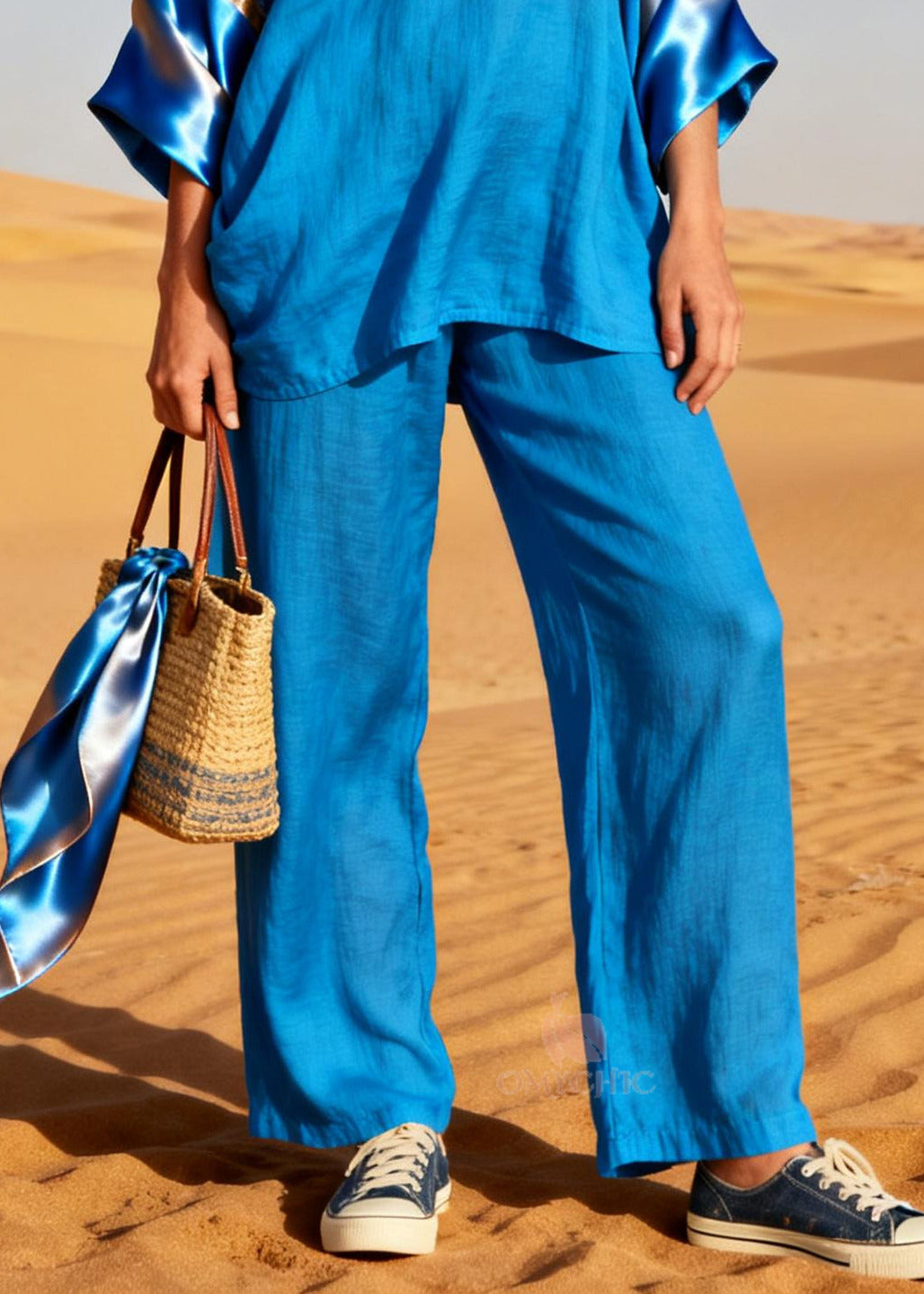Diy Blue Oversized Patchwork Linen Silk Two Piece Set Outfits Spring
