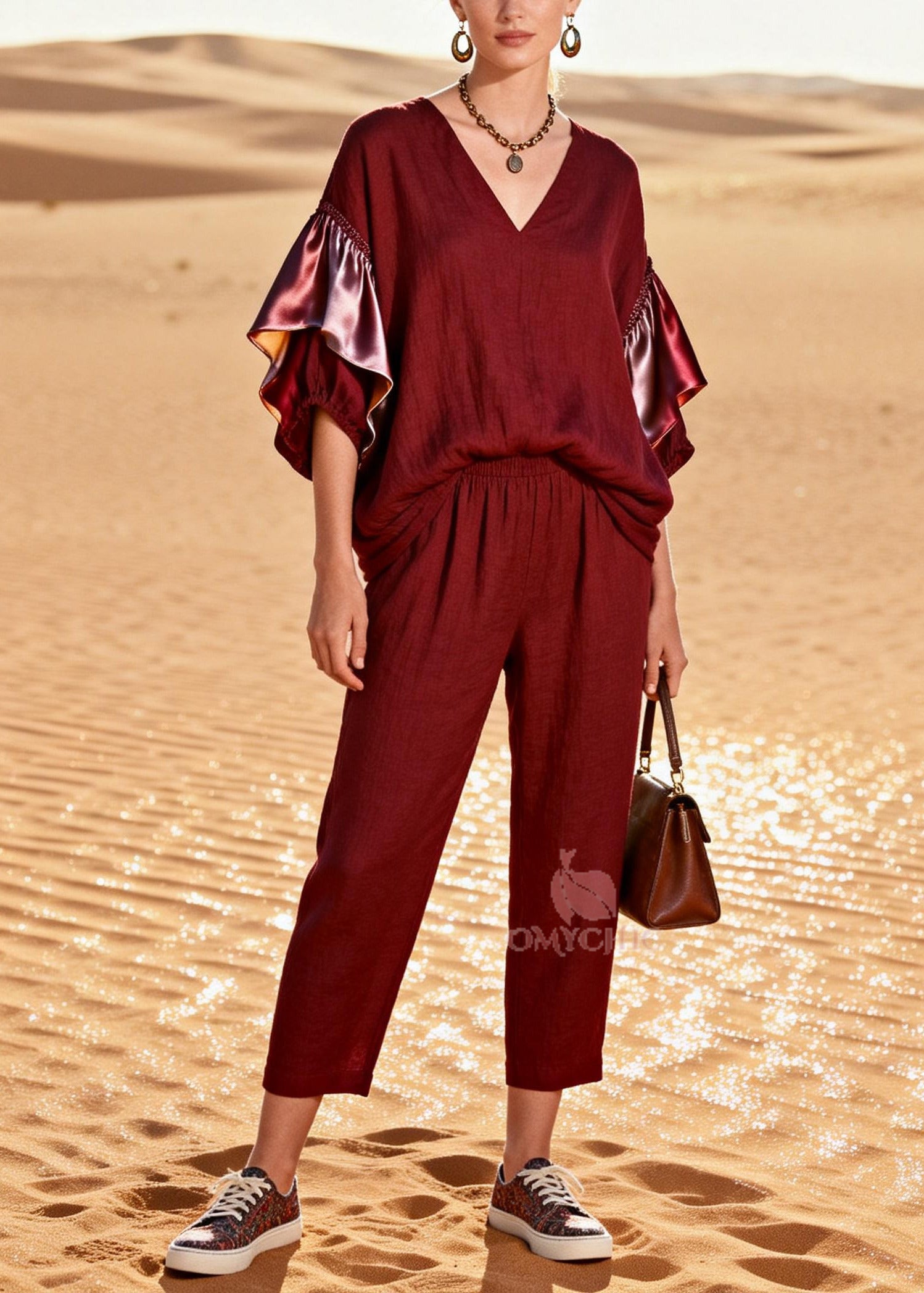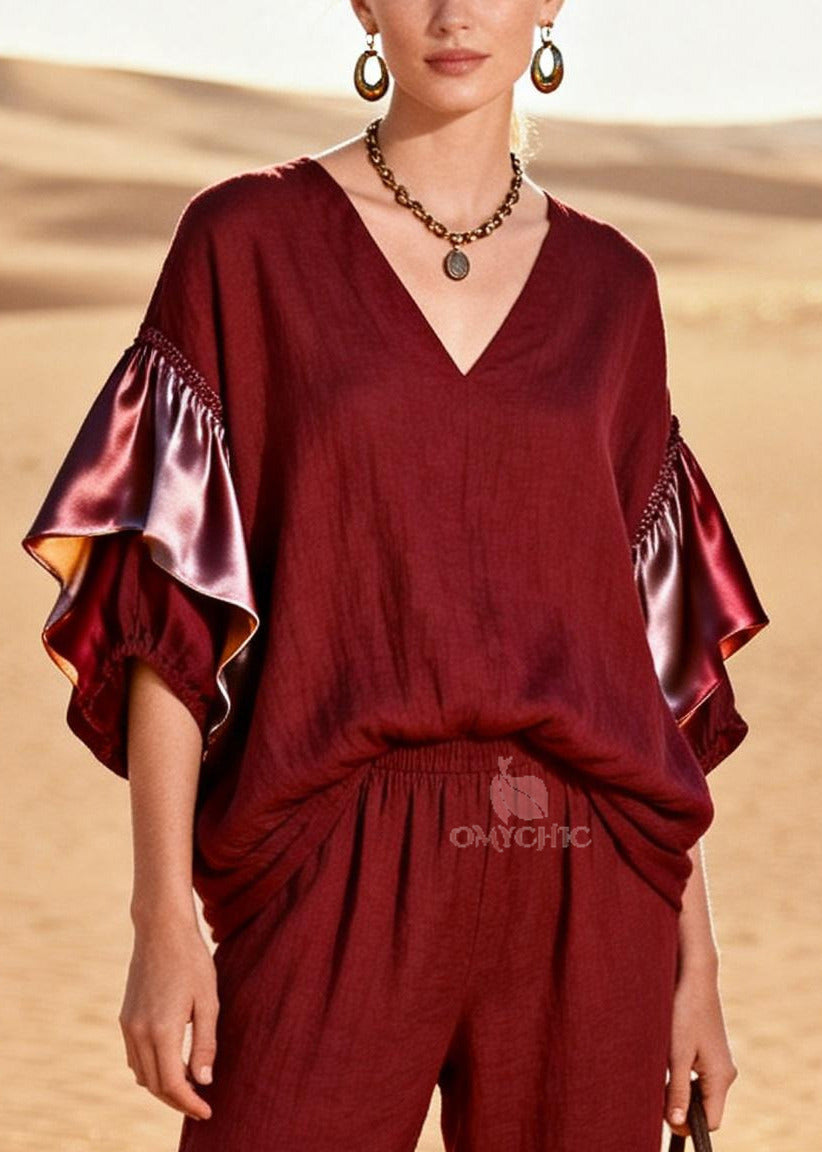 Bohemian Red Oversized Patchwork Linen Silk Two Piece Suit Set Spring