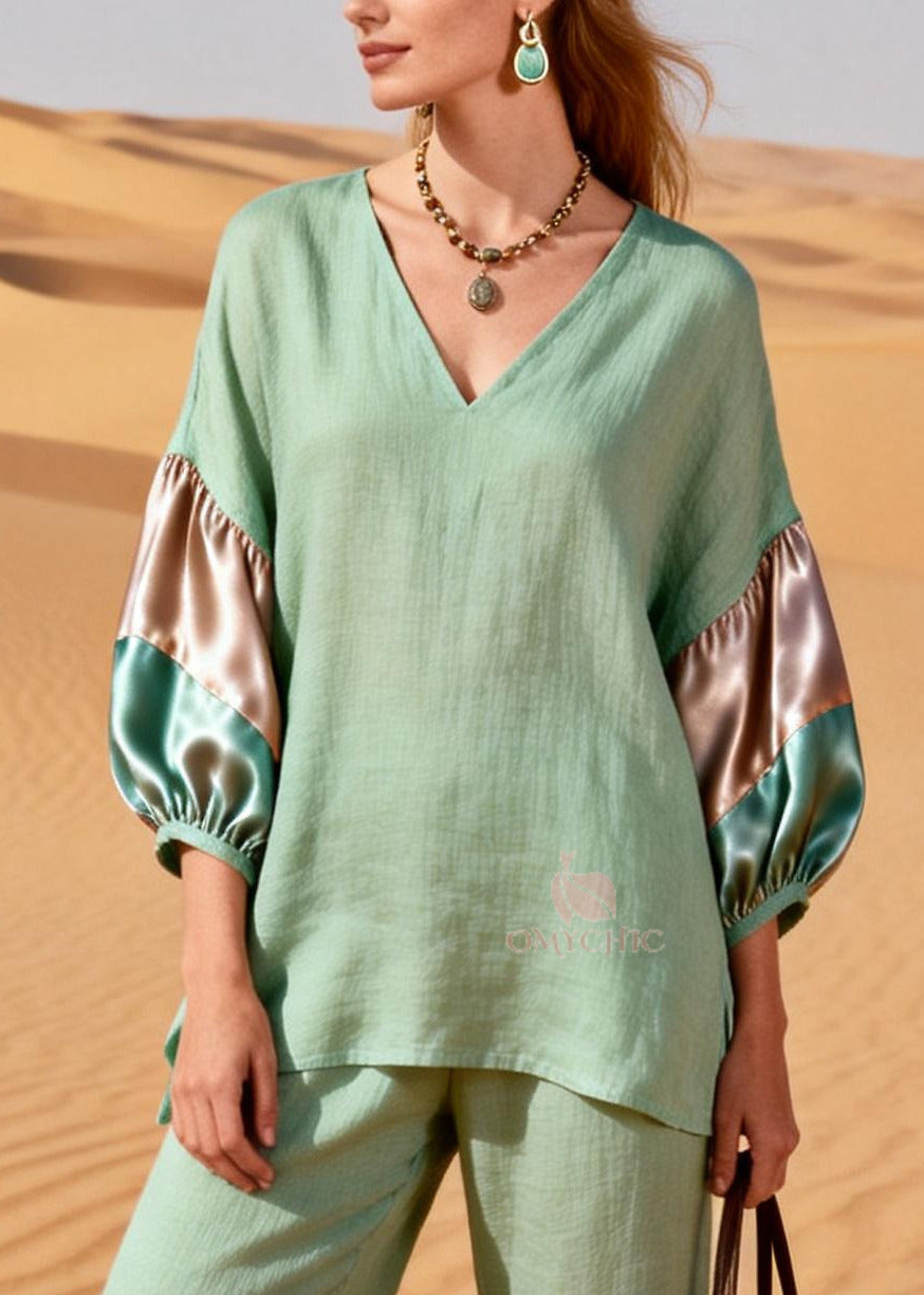 Grass Green Patchwork Linen Silk Two Pieces Set V Neck Summer