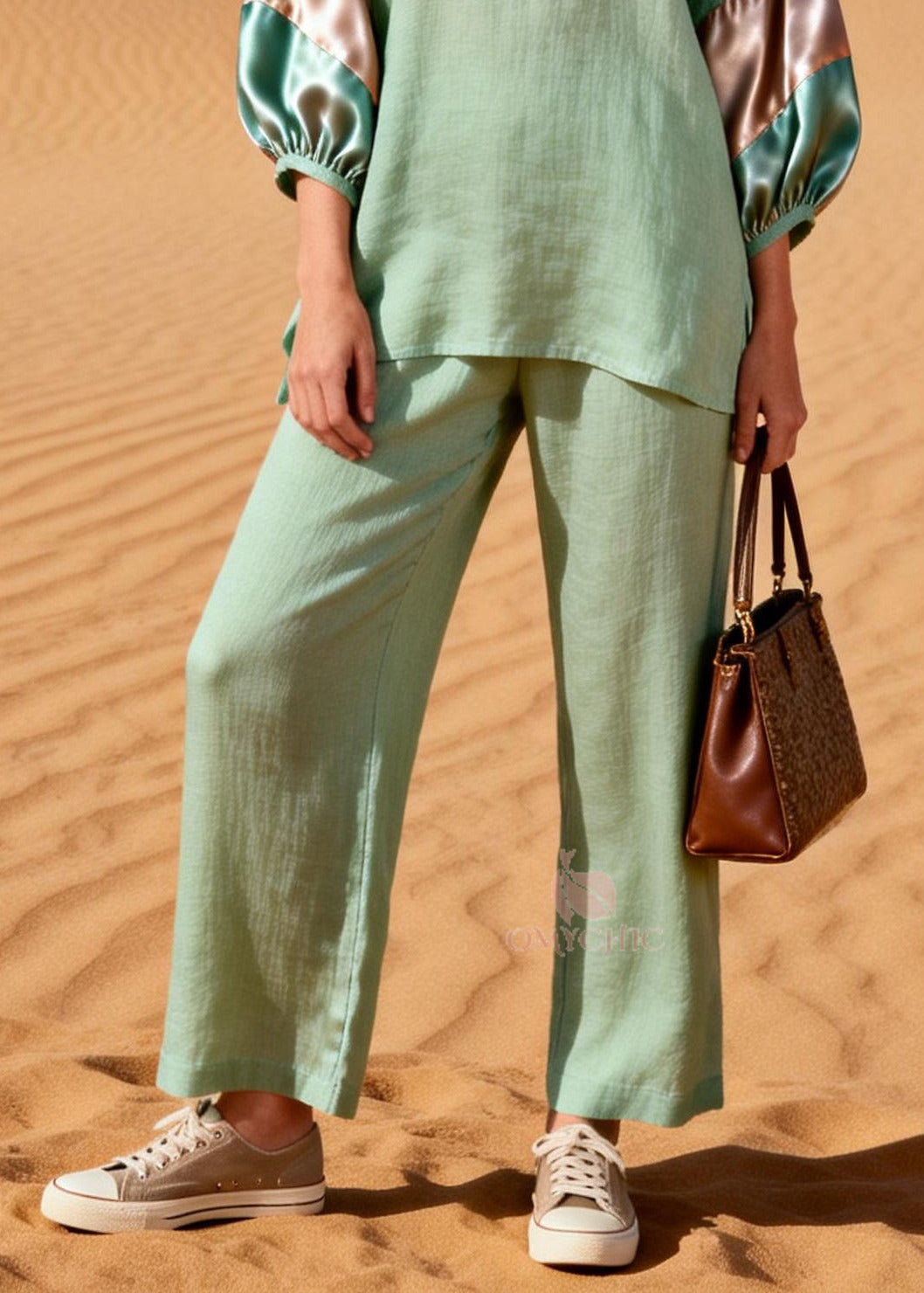 Fitted Khaki V Neck Patchwork Silk Linen 2 Piece Outfit Bracelet Sleeve
