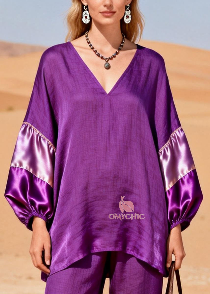 Women Dark Purple Oversized Patchwork Cotton Two Piece Set Spring