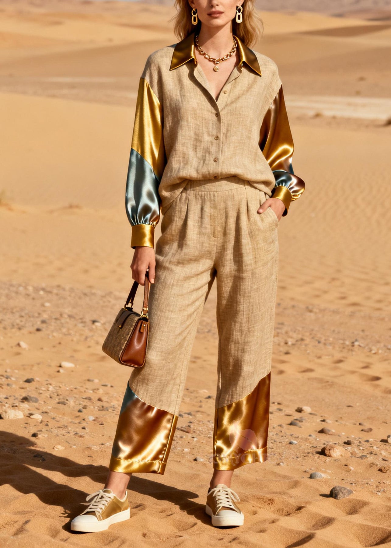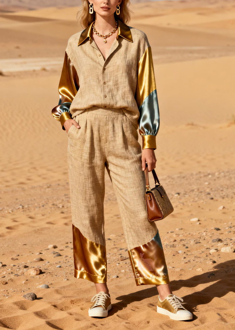 Chic Khaki Peter Pan Collar Patchwork Linen Silk Two Pieces Set Spring