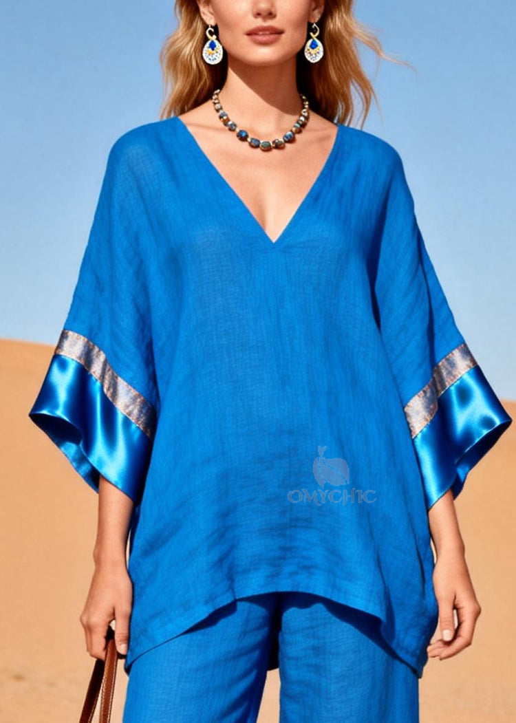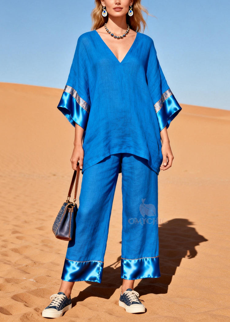 Fitted Blue Oversized Patchwork Silk Cotton Two Piece Set Women Clothing