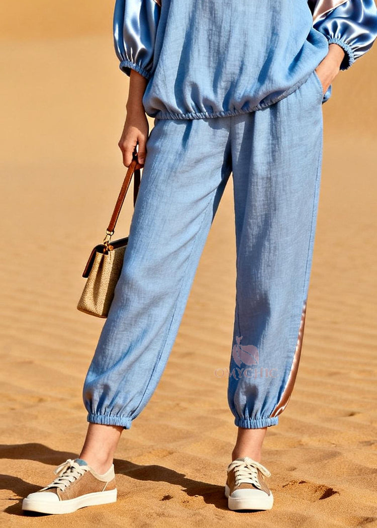 Modern Light Blue V Neck Patchwork Linen Silk Two Pieces Set Bracelet Sleeve