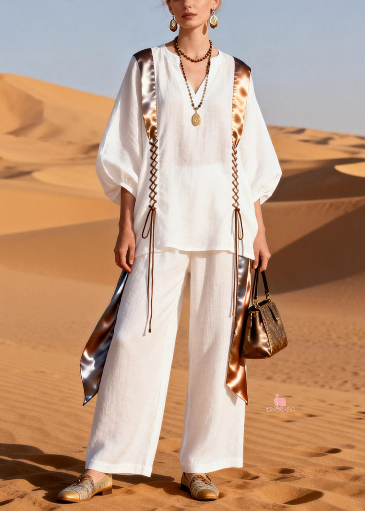 Stylish White V Neck Lace Up Patchwork Linen Two Pieces Set Lantern Sleeve
