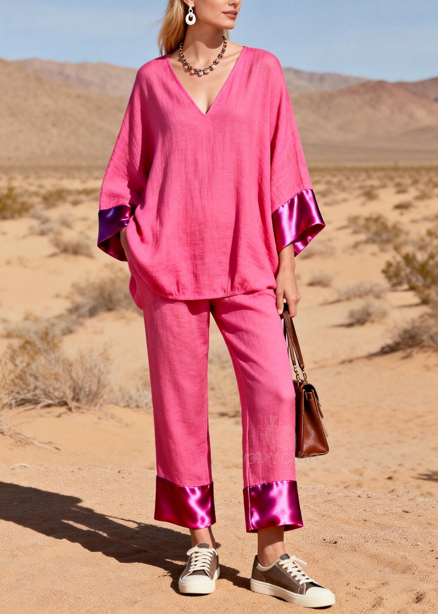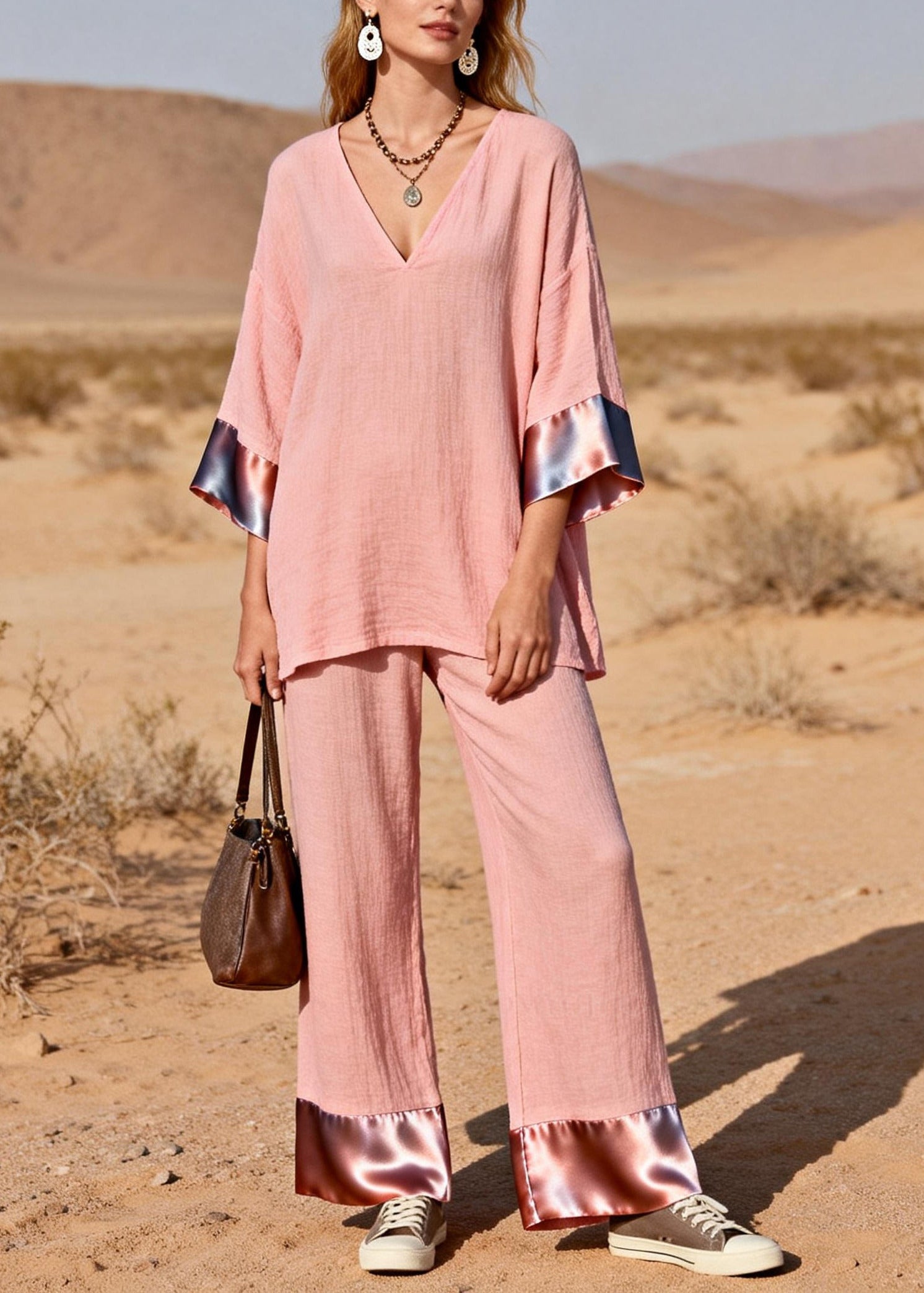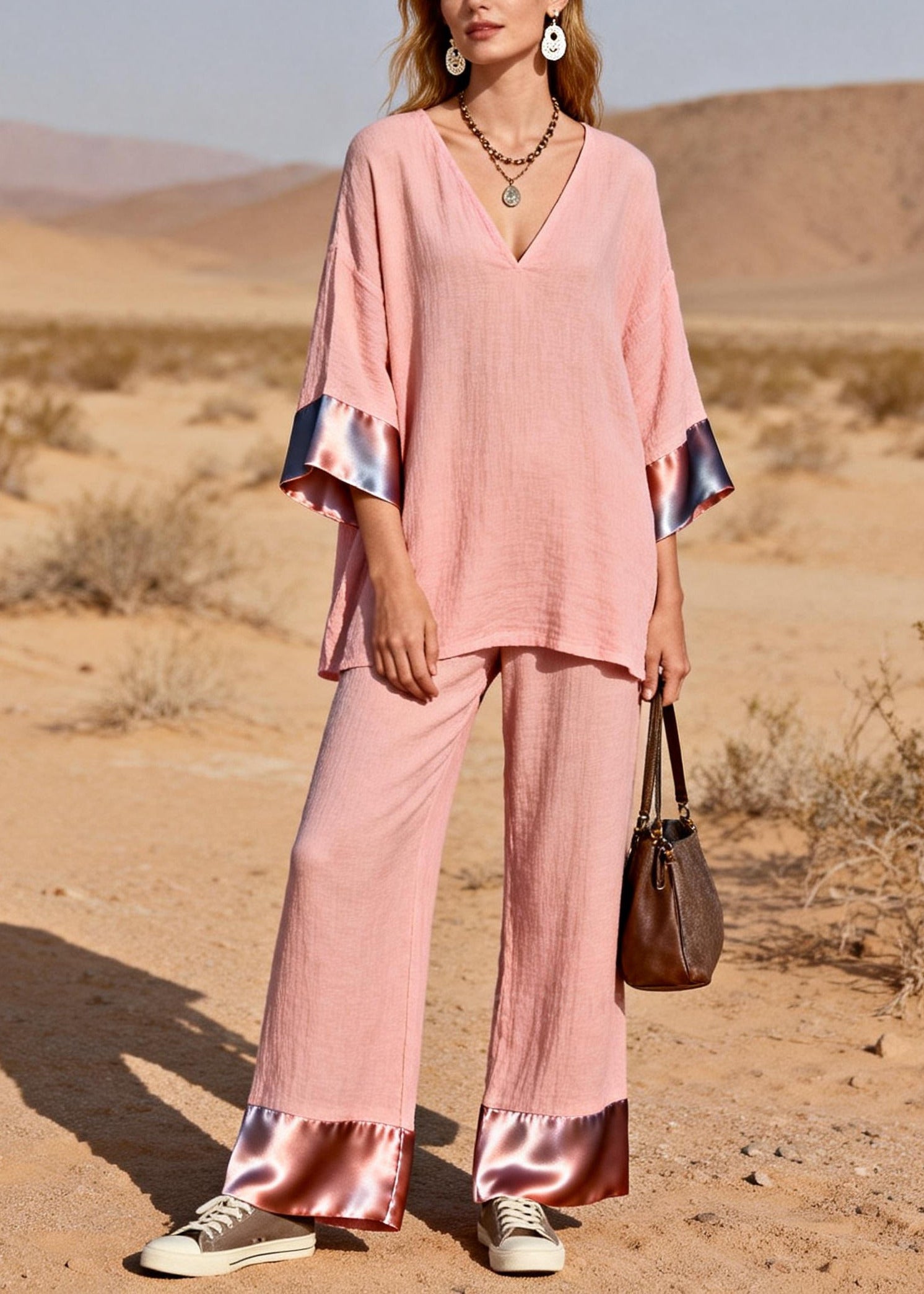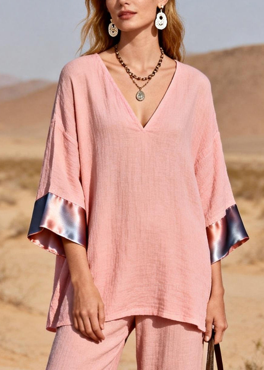 Bohemian Pink Oversized Patchwork Silk Cotton Two-Piece Set Spring