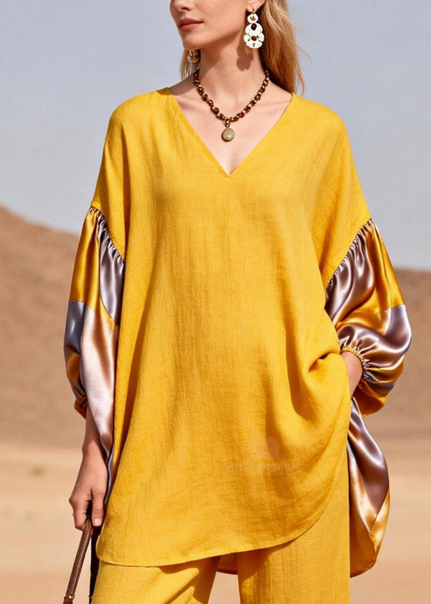 Italian Yellow V Neck Patchwork Silk Cotton Two Piece Suit Set Spring