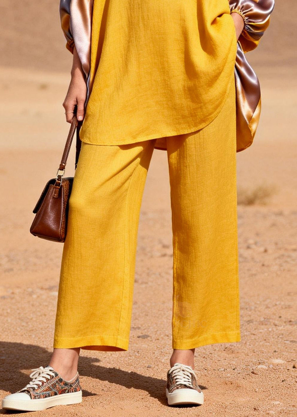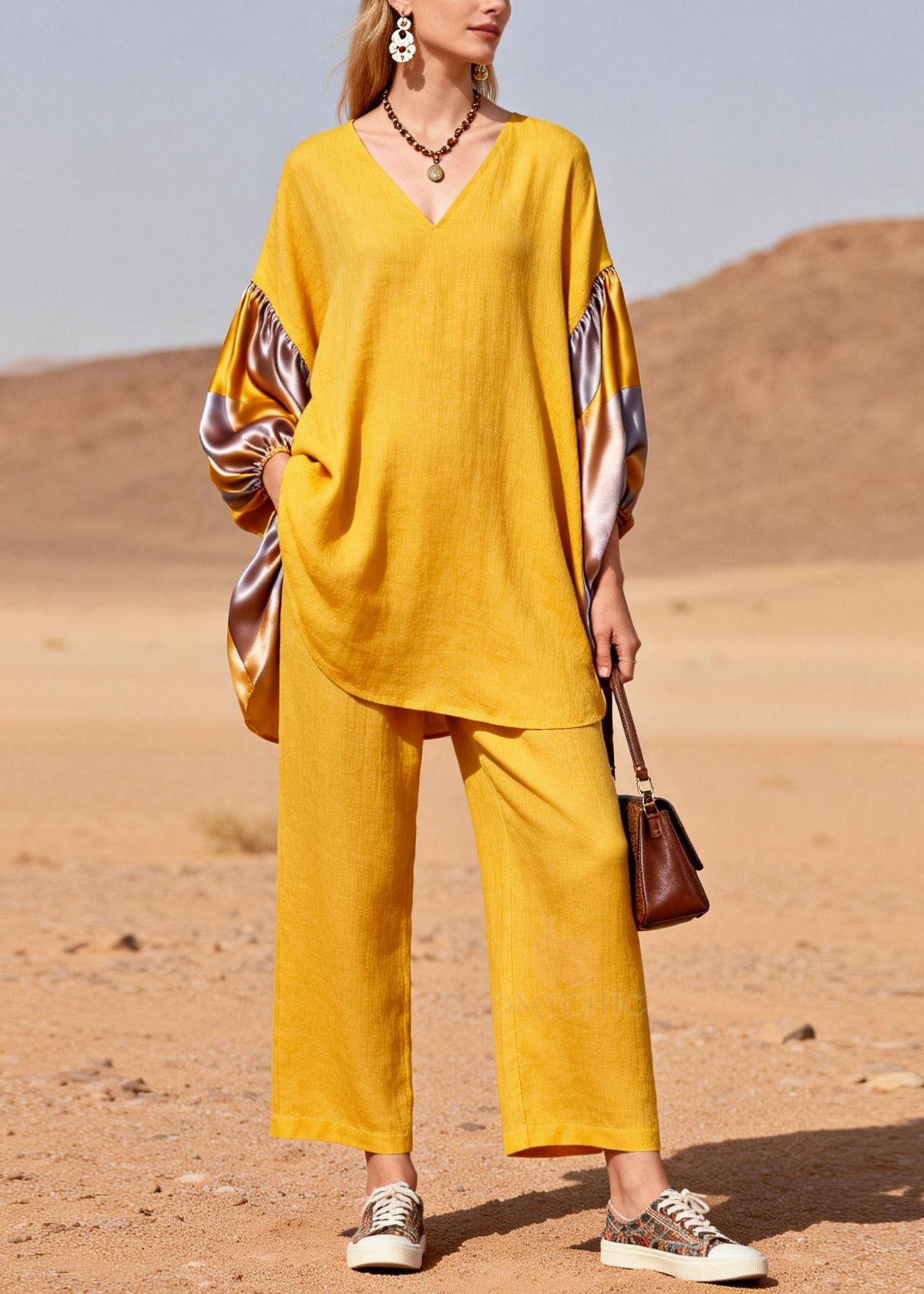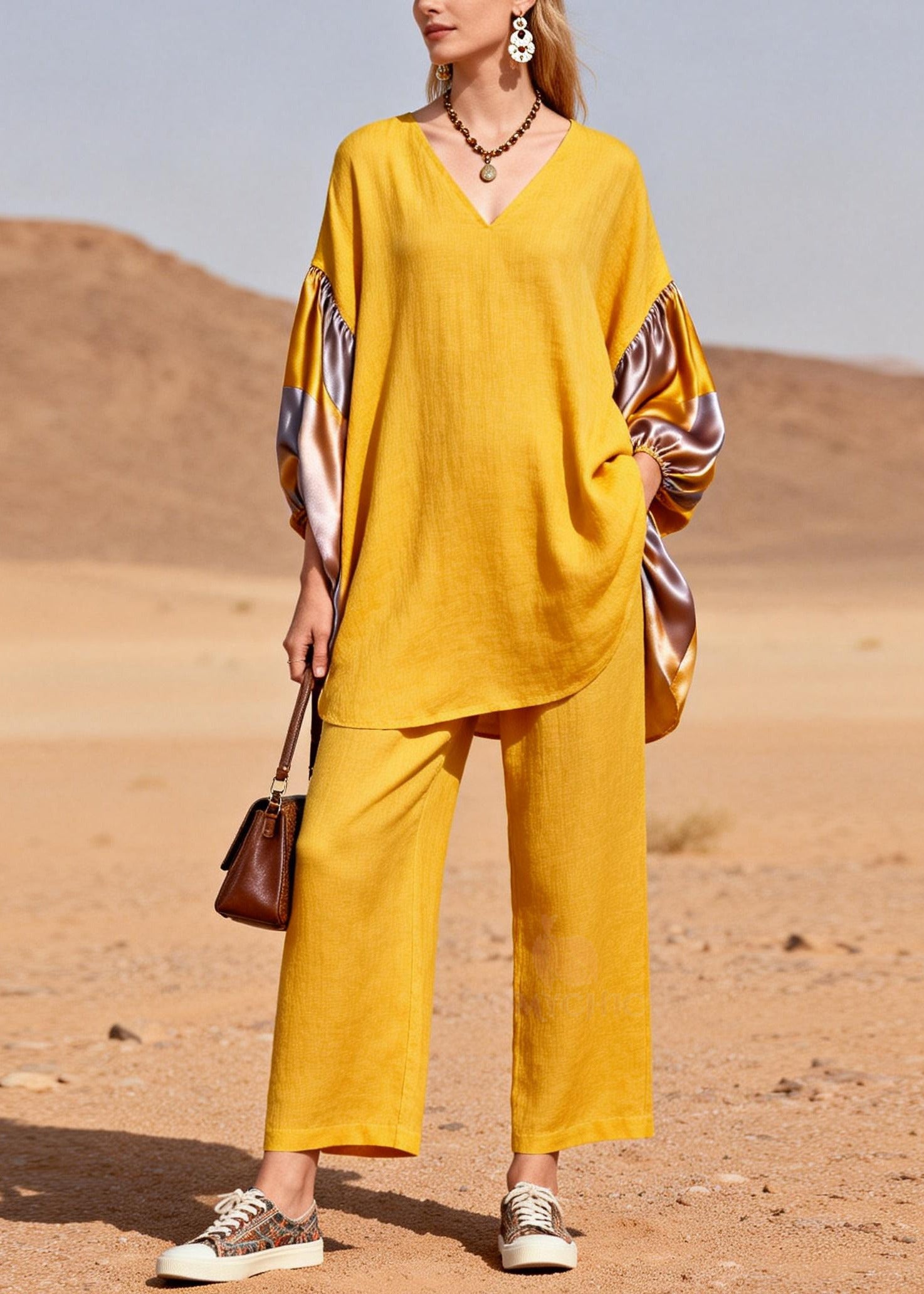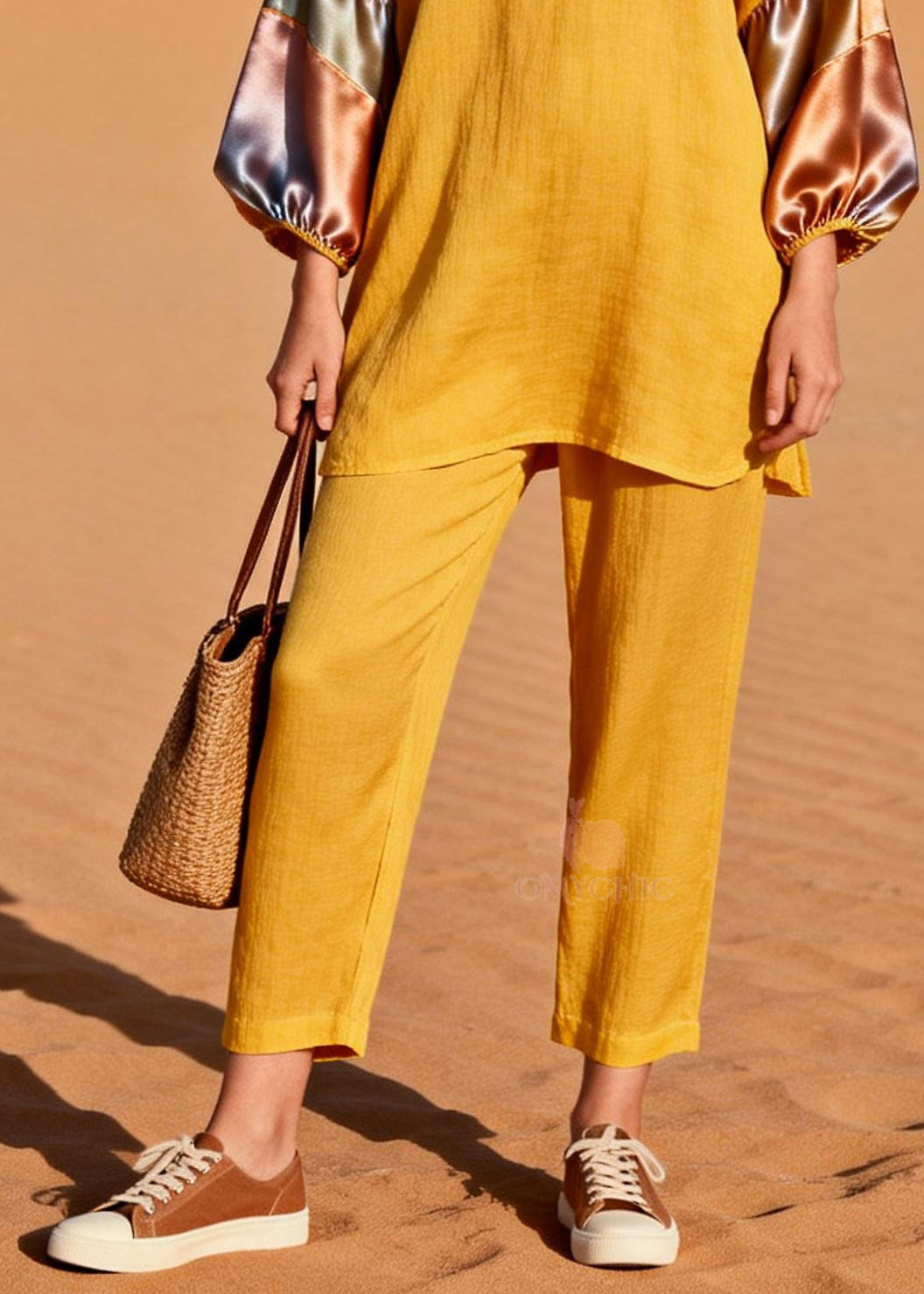 Bohemian Yellow Oversized Patchwork Silk Cotton Two Pieces Set Spring