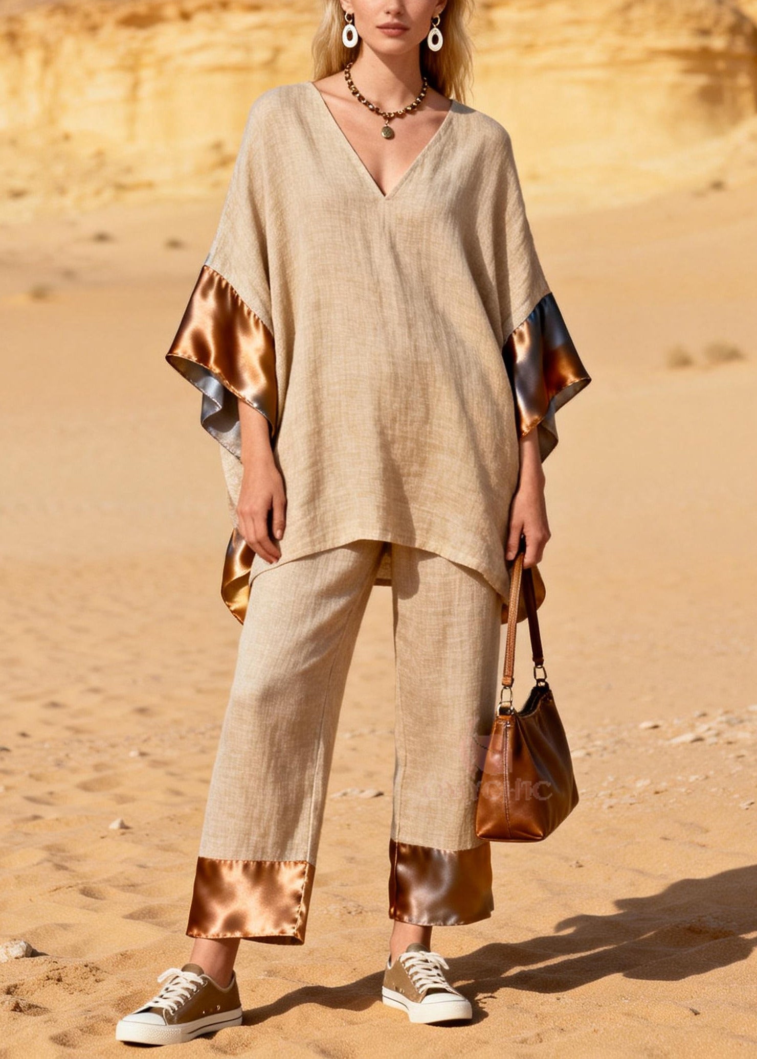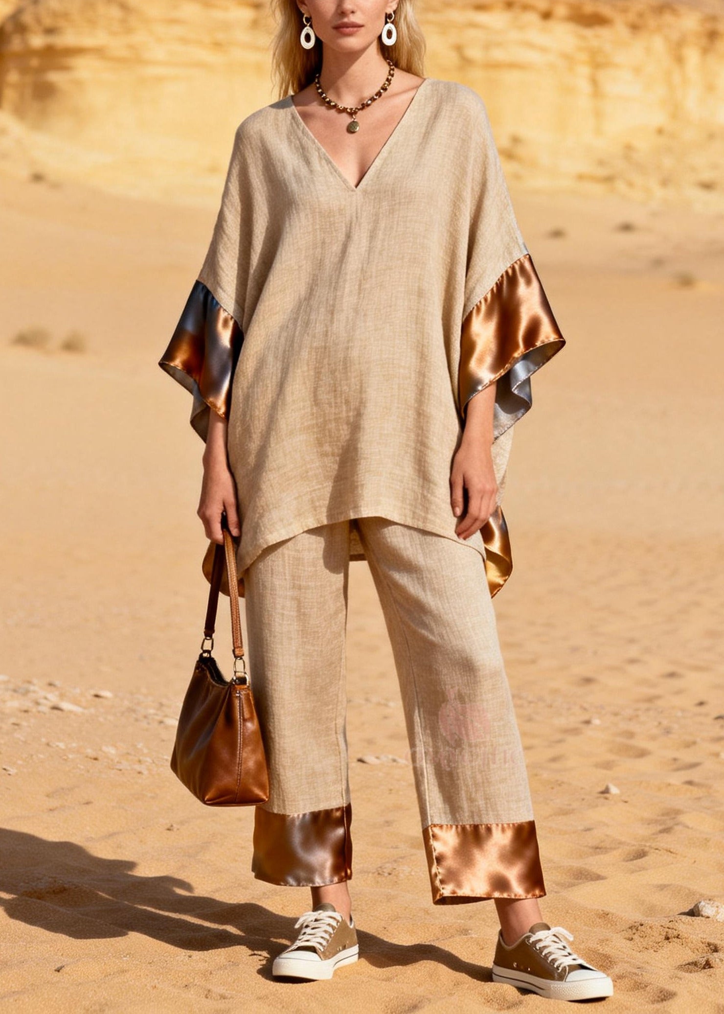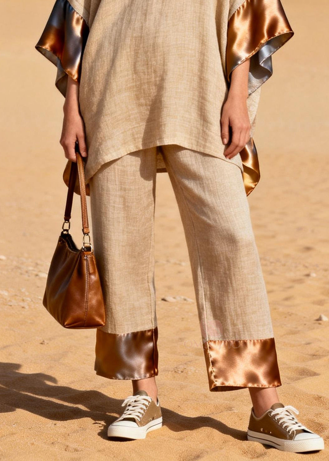 Casual Khaki Oversized Patchwork Silk Linen Two Pieces Set Summer