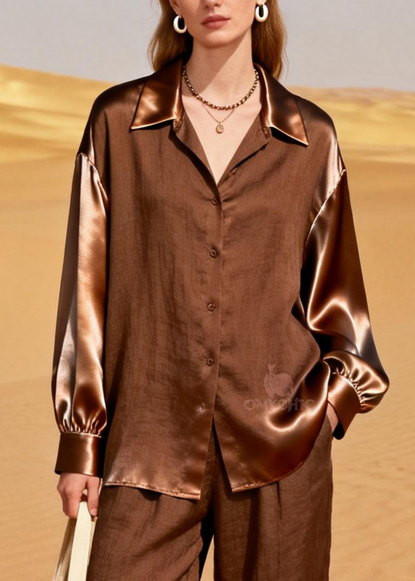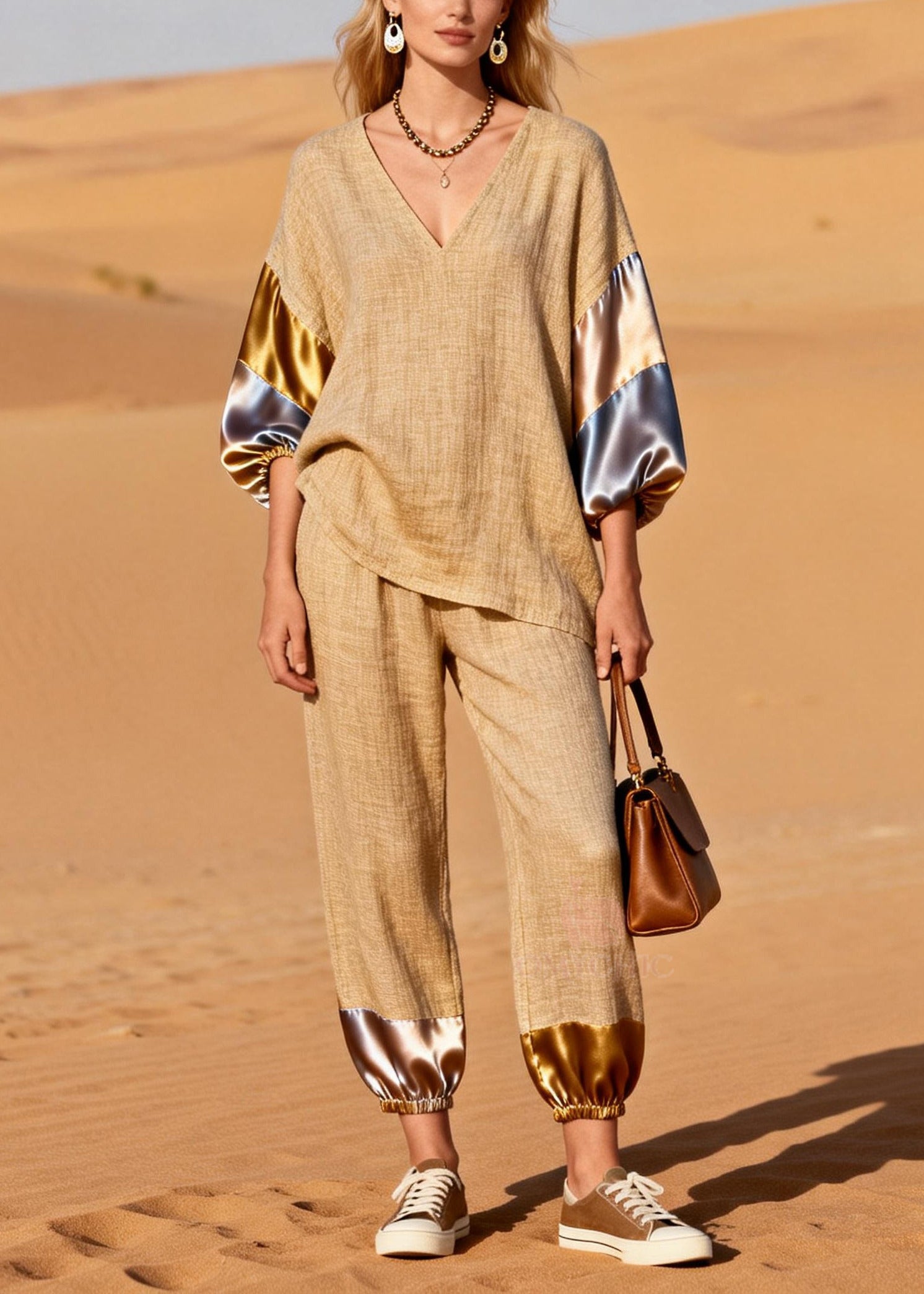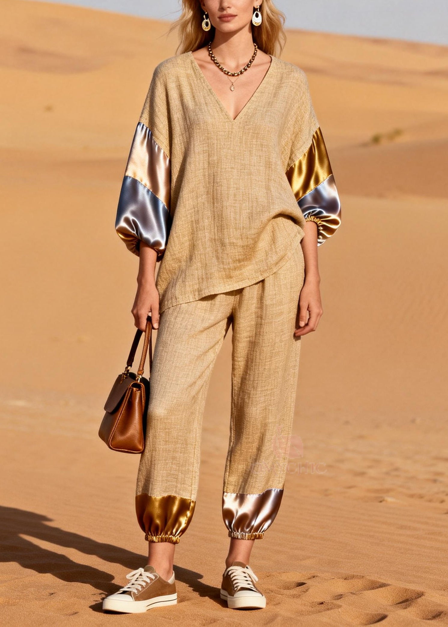 Casual Khaki Oversized Patchwork Silk Linen Two Pieces Set Summer