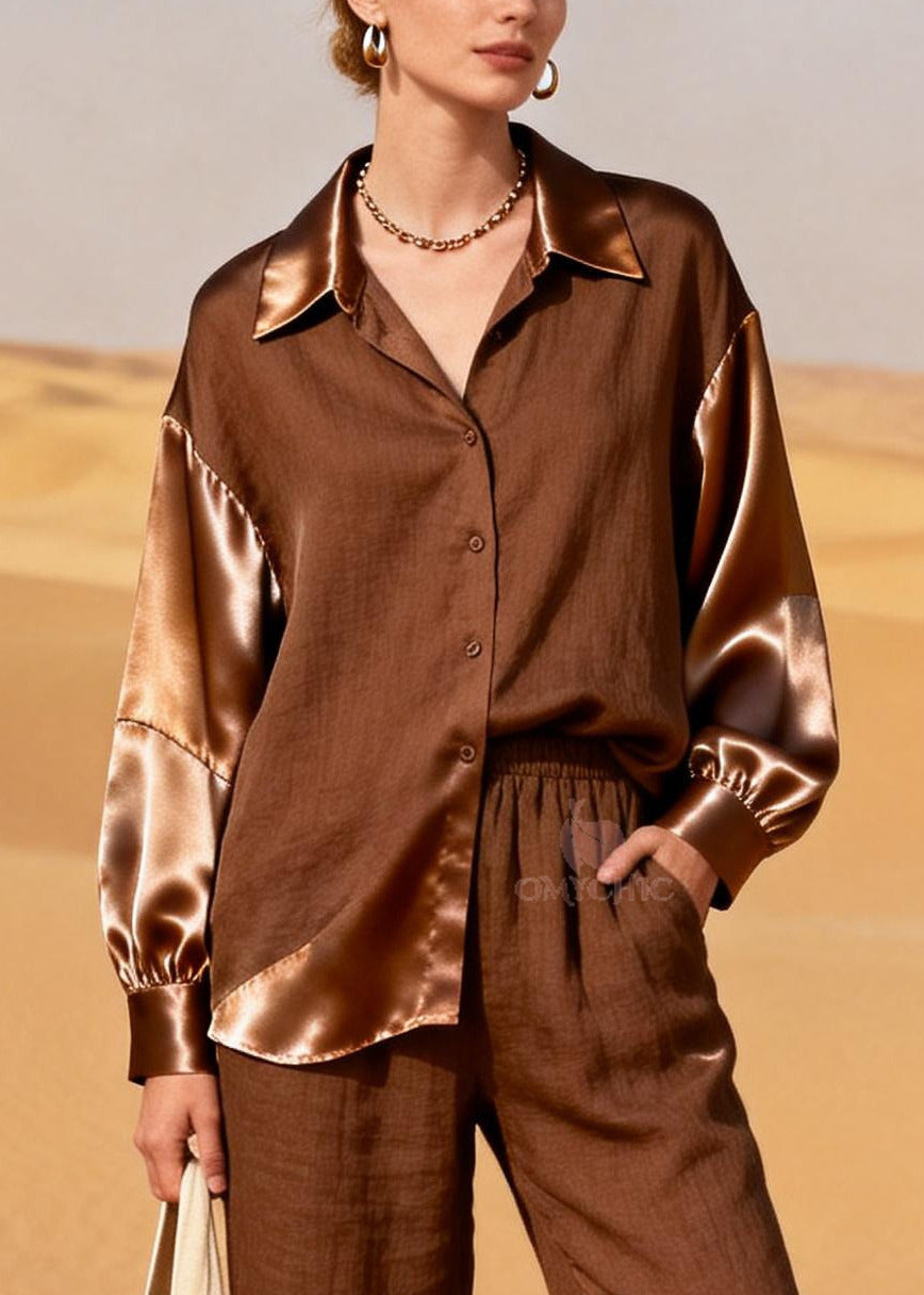 Women Coffee Peter Pan Collar Patchwork Linen Silk Two Piece Set Women Clothing Spring
