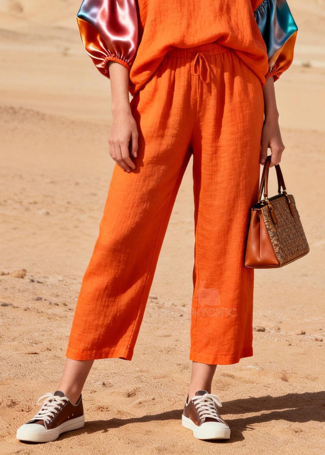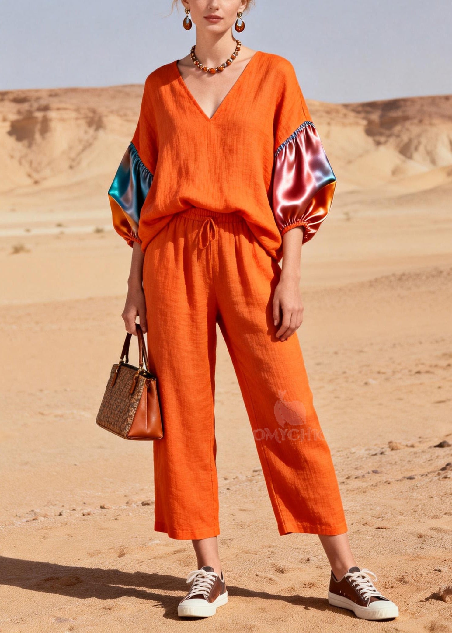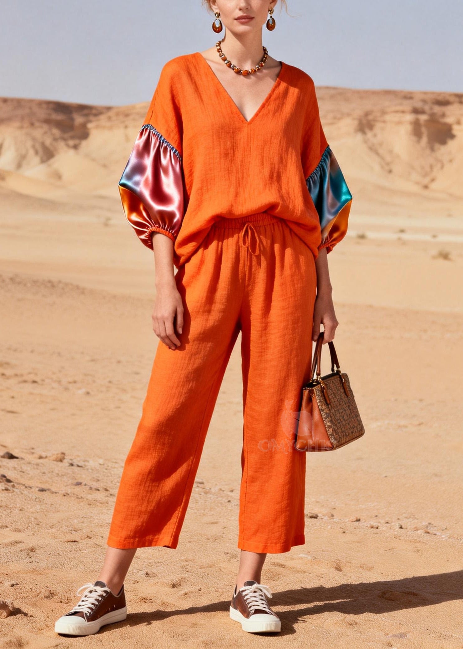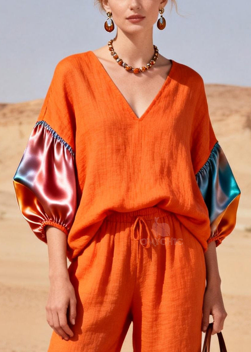 Fashion Orange V Neck Patchwork Linen 2 Piece Outfit Lantern Sleeve