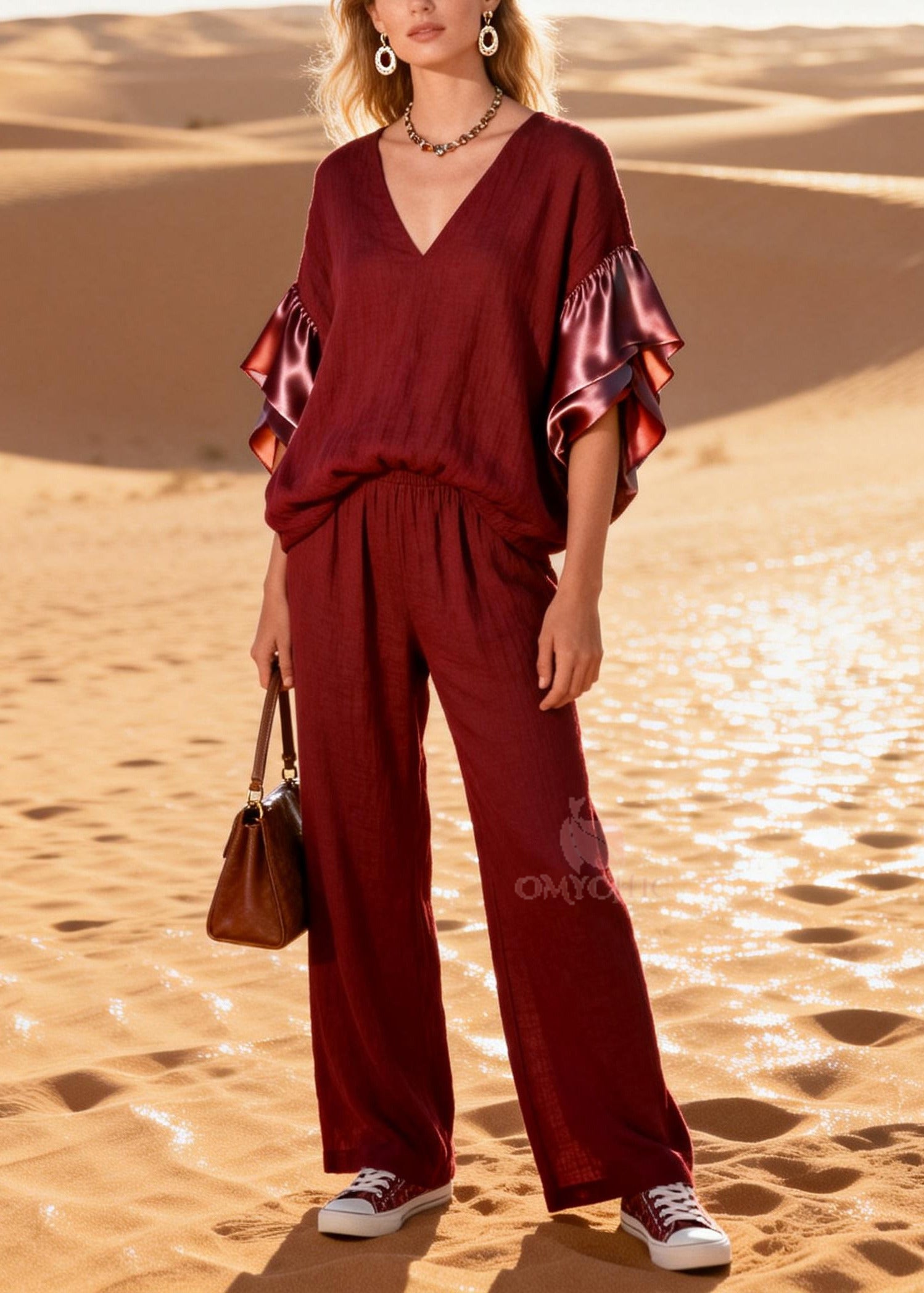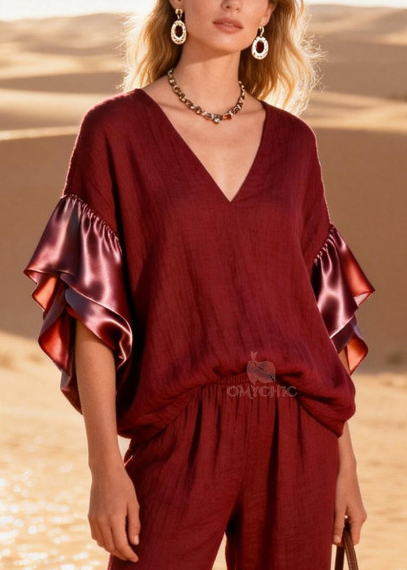 Women Mulberry V Neck Patchwork Linen Silk Two Pieces Set Flare Sleeve