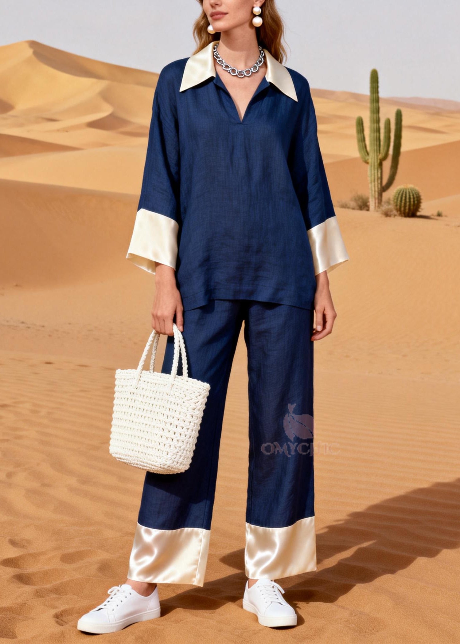 Loose Navy Peter Pan Collar Patchwork Silk Linen Two Piece Suit Set Spring