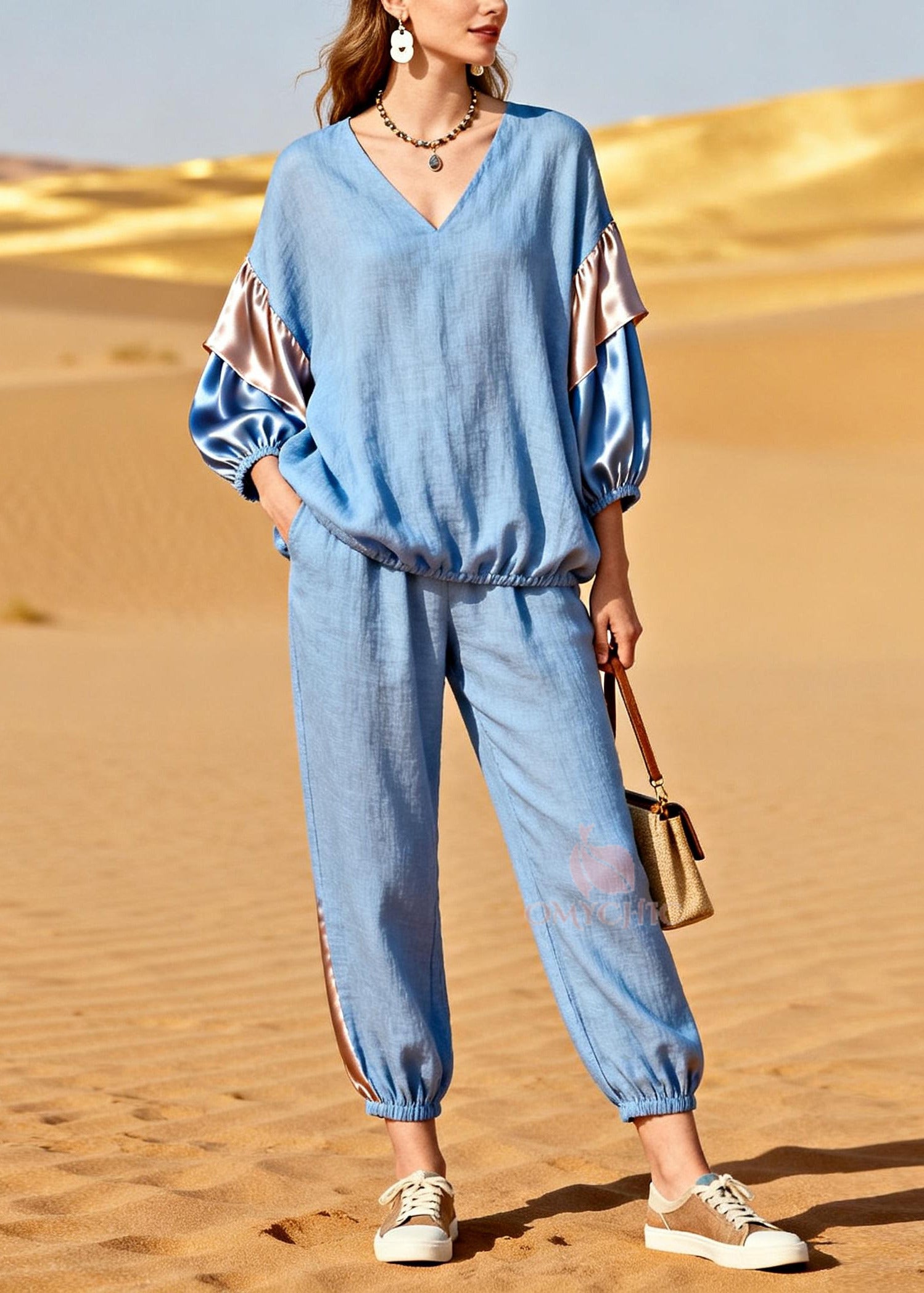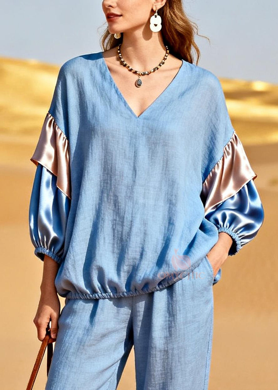 Modern Light Blue V Neck Patchwork Linen Silk Two Pieces Set Bracelet Sleeve