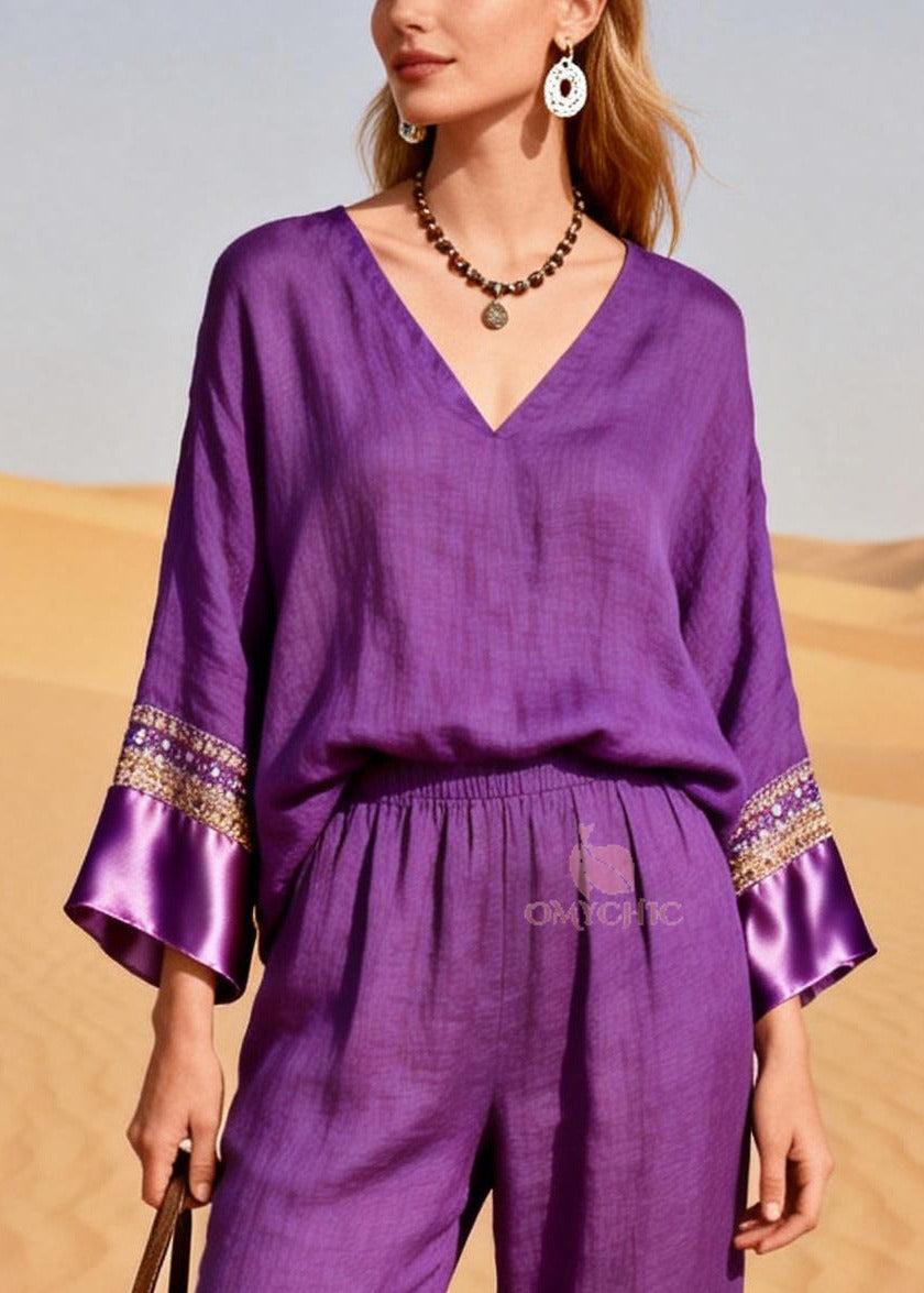 Organic Purple V Neck Patchwork Silk Cotton Two Piece Set Spring