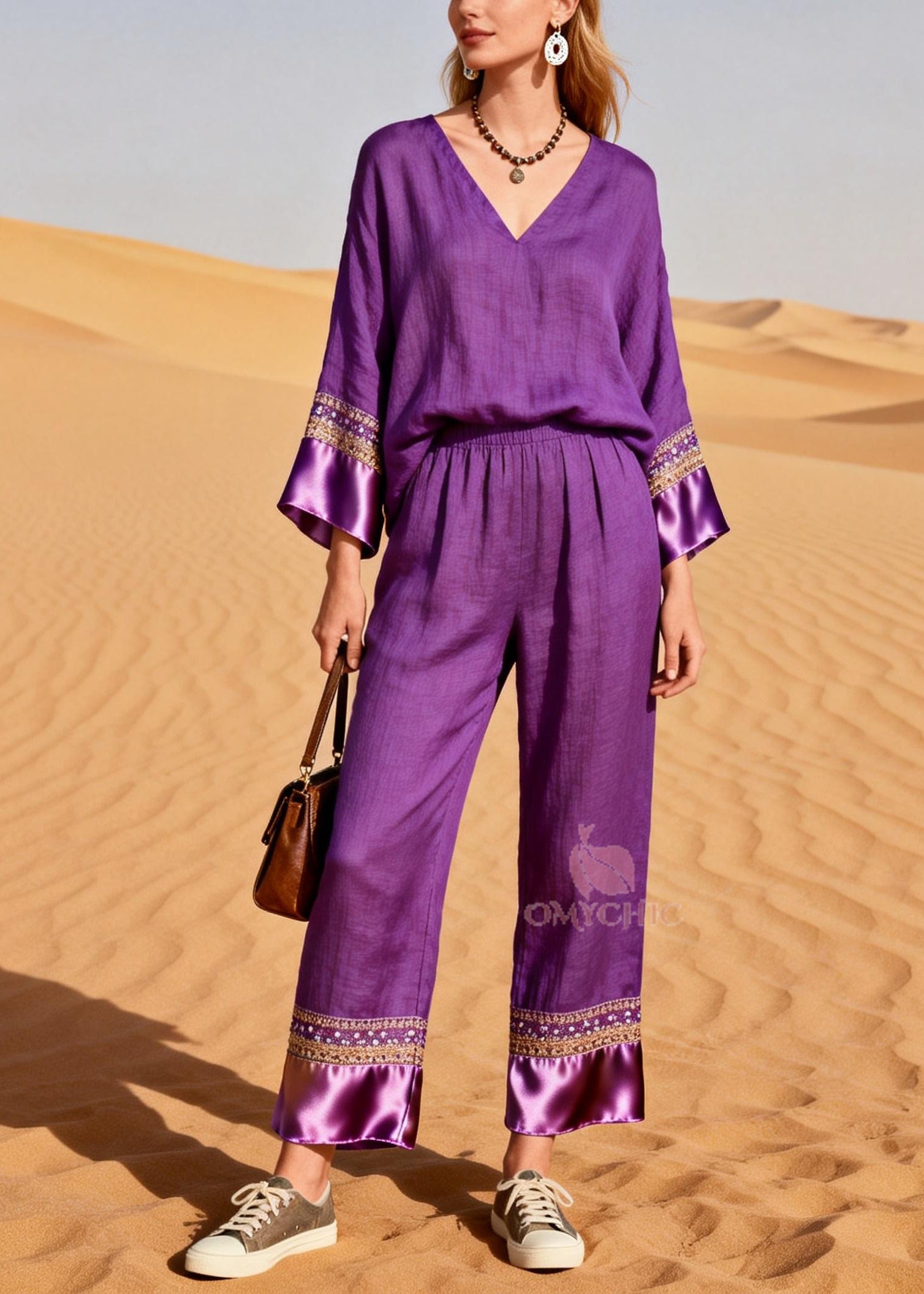 Style Purple Oversized Patchwork Silk Linen Two Pieces Set Summer