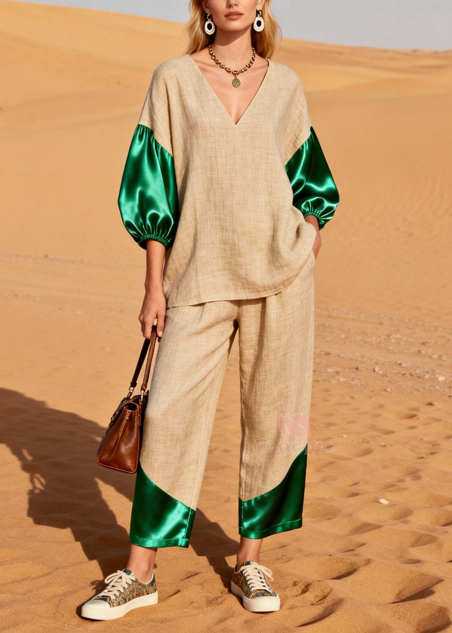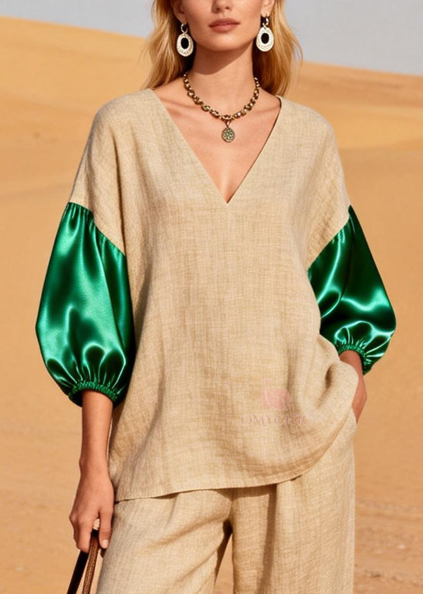 Peacock Green Patchwork Linen Two Pieces Set V Neck Bracelet Sleeve